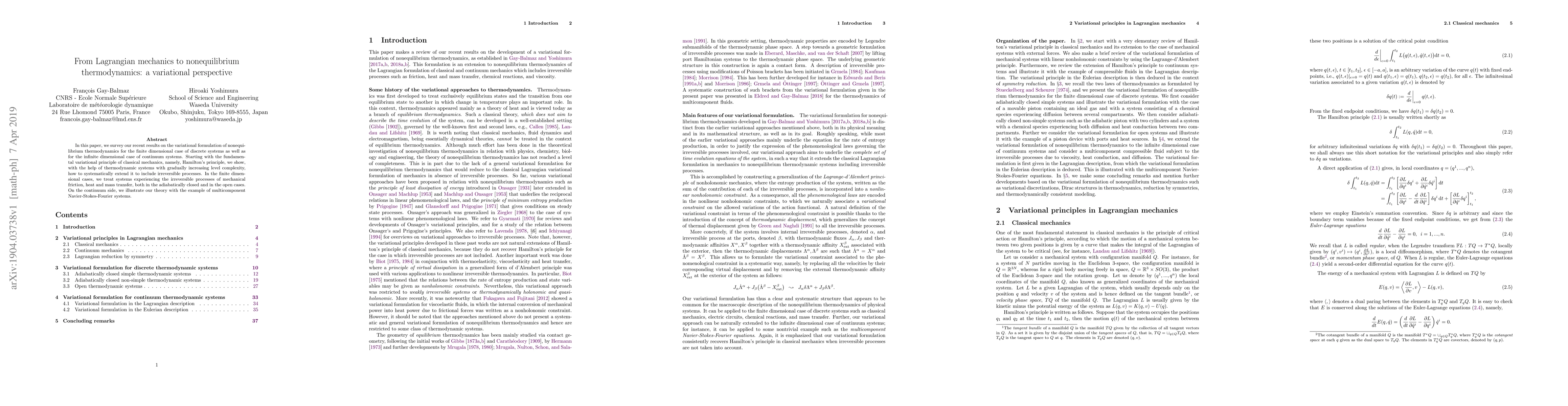 This paper surveys variational formulations extending Hamilton's principle from Lagrangian mechanics to nonequilibrium thermodynamics, covering both discrete and continuum systems. It systematically incorporates irreversible processes like friction, heat, and mass transfer, exemplified by multicomponent Navier-Stokes-Fourier systems.