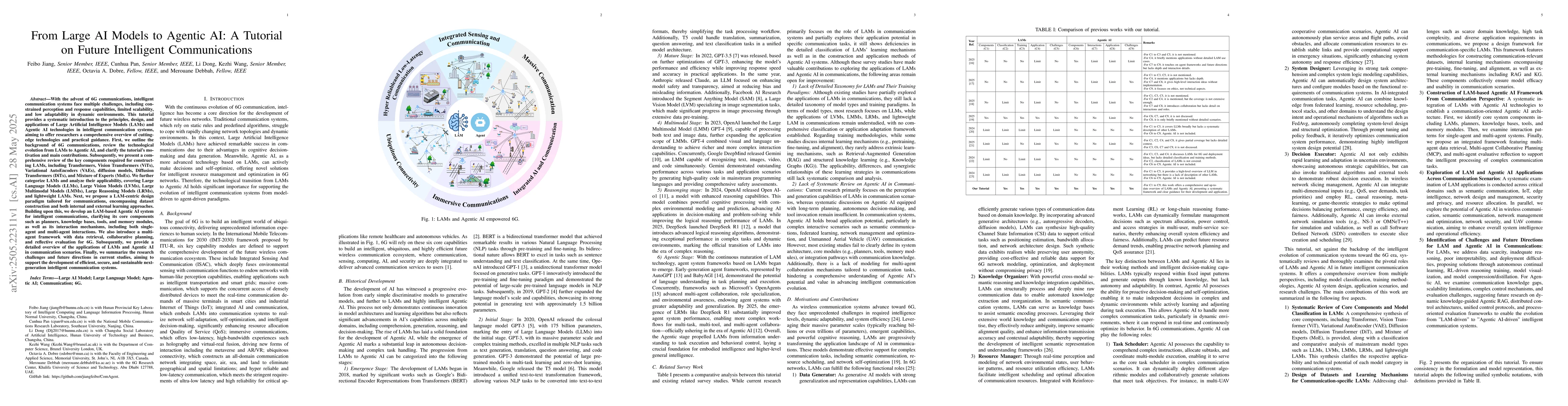The paper provides a systematic introduction and comprehensive review of Large Artificial Intelligence Models (LAMs) and Agentic AI technologies, focusing on their design, applications, and integration into intelligent communication systems, particularly for 6G networks.