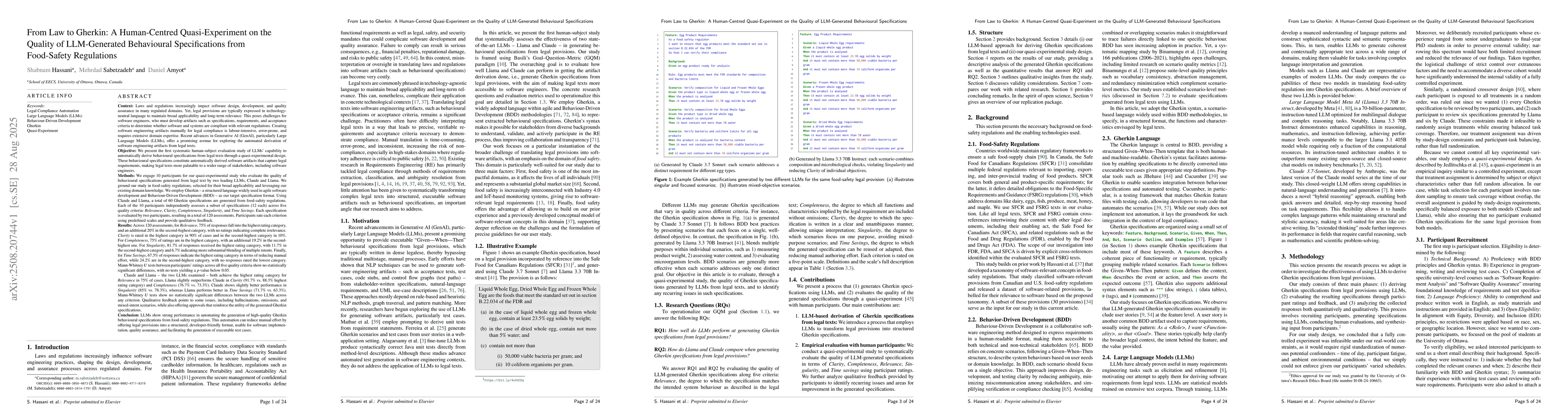 Context: Laws and regulations increasingly affect software design and quality assurance, but legal texts are written in technology-neutral language. This creates challenges for engineers who must develop compliance artifacts such as requirements and acceptance criteria. Manual creation is labor-intensive, error-prone, and requires domain expertise. Advances in Generative AI (GenAI), especially Large Language Models (LLMs), offer a way to automate deriving such artifacts. Objective: We present the first systematic human-subject study of LLMs' ability to derive behavioral specifications from legal texts using a quasi-experimental design. These specifications translate legal requirements into a developer-friendly form. Methods: Ten participants evaluated specifications generated from food-safety regulations by Claude and Llama. Using Gherkin, a structured BDD language, 60 specifications were produced. Each participant assessed 12 across five criteria: Relevance, Clarity, Completeness, Singularity, and Time Savings. Each specification was reviewed by two participants, yielding 120 assessments. Results: For Relevance, 75% of ratings were highest and 20% second-highest. Clarity reached 90% highest. Completeness: 75% highest, 19% second. Singularity: 82% highest, 12% second. Time Savings: 68% highest, 24% second. No lowest ratings occurred. Mann-Whitney U tests showed no significant differences across participants or models. Llama slightly outperformed Claude in Clarity, Completeness, and Time Savings, while Claude was stronger in Singularity. Feedback noted hallucinations and omissions but confirmed the utility of the specifications. Conclusion: LLMs can generate high-quality Gherkin specifications from legal texts, reducing manual effort and providing structured artifacts useful for implementation, assurance, and test generation.