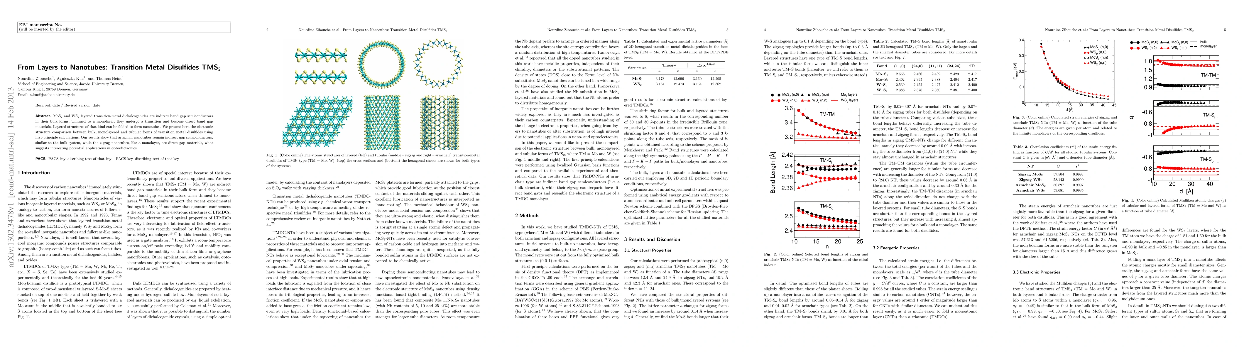 MoS2 and WS2 layered transition-metal dichalcogenides are indirect band gap semiconductors in their bulk forms. Thinned to a monolayer, they undergo a transition and become direct band gap materials. Layered structures of that kind can be folded to form nanotubes. We present here the electronic structure comparison between bulk, monolayered and tubular forms of transition metal disulfides using first-principle calculations. Our results show that armchair nanotubes remain indirect gap semiconductors, similar to the bulk system, while the zigzag nanotubes, like a monolayer, are direct gap materials, what suggests interesting potential applications in optoelectronics.