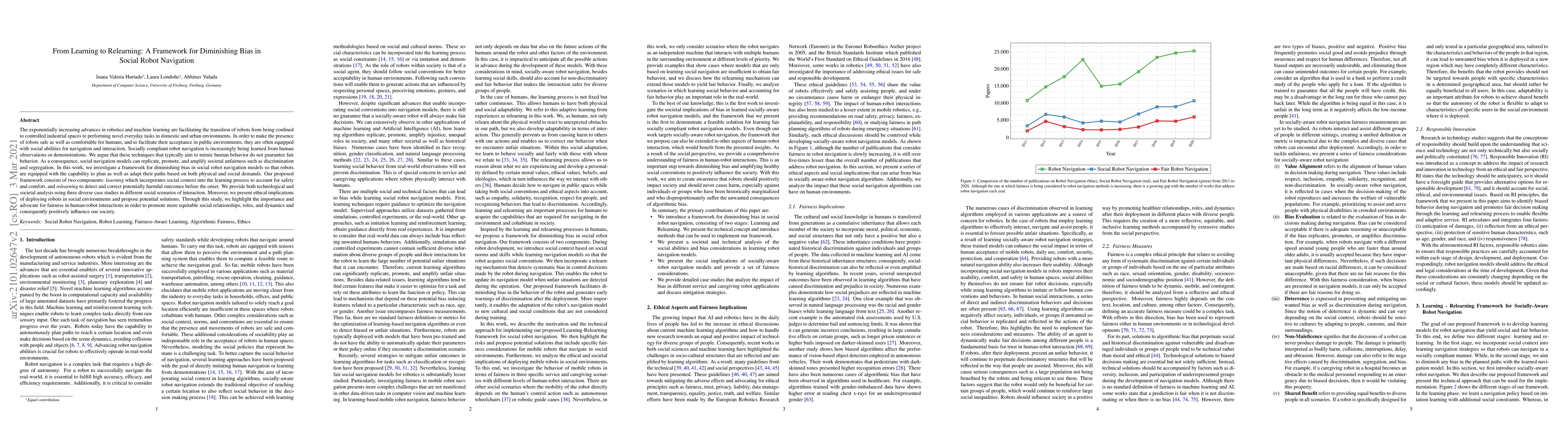 The exponentially increasing advances in robotics and machine learning are facilitating the transition of robots from being confined to controlled industrial spaces to performing novel everyday tasks in domestic and urban environments. In order to make the presence of robots safe as well as comfortable for humans, and to facilitate their acceptance in public environments, they are often equipped with social abilities for navigation and interaction. Socially compliant robot navigation is increasingly being learned from human observations or demonstrations. We argue that these techniques that typically aim to mimic human behavior do not guarantee fair behavior. As a consequence, social navigation models can replicate, promote, and amplify societal unfairness such as discrimination and segregation. In this work, we investigate a framework for diminishing bias in social robot navigation models so that robots are equipped with the capability to plan as well as adapt their paths based on both physical and social demands. Our proposed framework consists of two components: \textit{learning} which incorporates social context into the learning process to account for safety and comfort, and \textit{relearning} to detect and correct potentially harmful outcomes before the onset. We provide both technological and societal analysis using three diverse case studies in different social scenarios of interaction. Moreover, we present ethical implications of deploying robots in social environments and propose potential solutions. Through this study, we highlight the importance and advocate for fairness in human-robot interactions in order to promote more equitable social relationships, roles, and dynamics and consequently positively influence our society.