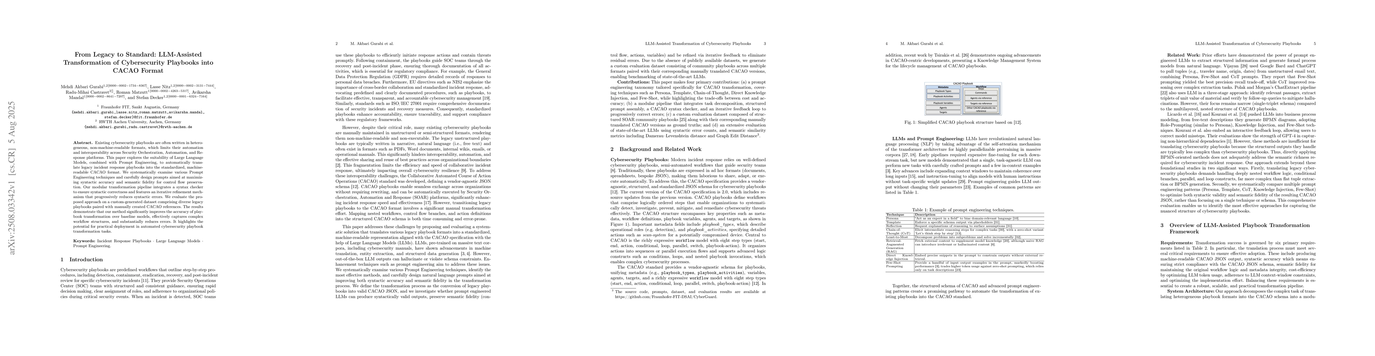 Existing cybersecurity playbooks are often written in heterogeneous, non-machine-readable formats, which limits their automation and interoperability across Security Orchestration, Automation, and Response platforms. This paper explores the suitability of Large Language Models, combined with Prompt Engineering, to automatically translate legacy incident response playbooks into the standardized, machine-readable CACAO format. We systematically examine various Prompt Engineering techniques and carefully design prompts aimed at maximizing syntactic accuracy and semantic fidelity for control flow preservation. Our modular transformation pipeline integrates a syntax checker to ensure syntactic correctness and features an iterative refinement mechanism that progressively reduces syntactic errors. We evaluate the proposed approach on a custom-generated dataset comprising diverse legacy playbooks paired with manually created CACAO references. The results demonstrate that our method significantly improves the accuracy of playbook transformation over baseline models, effectively captures complex workflow structures, and substantially reduces errors. It highlights the potential for practical deployment in automated cybersecurity playbook transformation tasks.