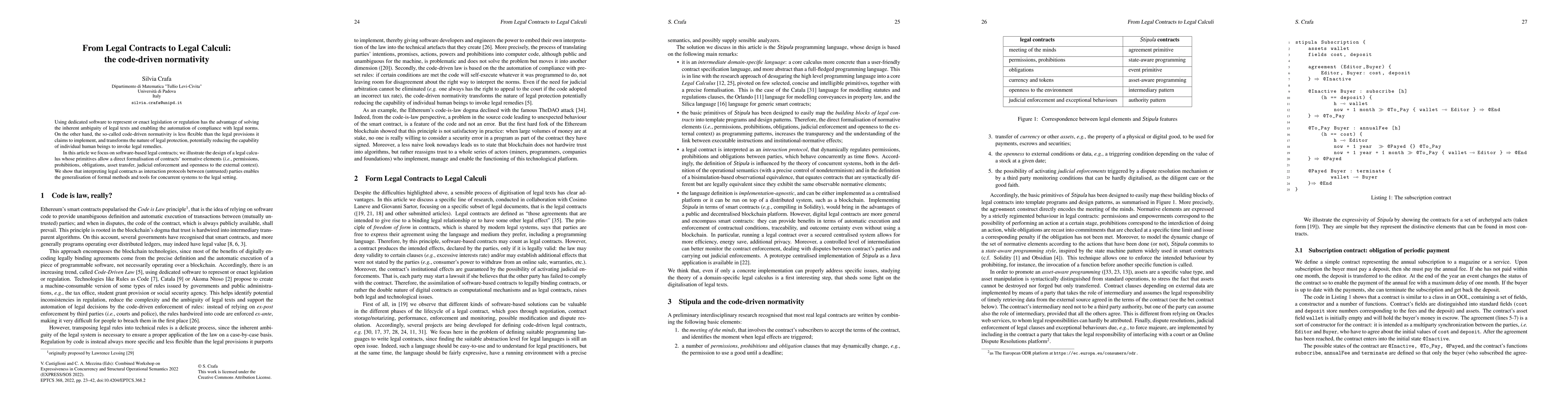 Using dedicated software to represent or enact legislation or regulation has the advantage of solving the inherent ambiguity of legal texts and enabling the automation of compliance with legal norms. On the other hand, the so-called code-driven normativity is less flexible than the legal provisions it claims to implement, and transforms the nature of legal protection, potentially reducing the capability of individual human beings to invoke legal remedies. In this article we focus on software-based legal contracts; we illustrate the design of a legal calculus whose primitives allow a direct formalisation of contracts' normative elements (i.e., permissions, prohibitions, obligations, asset transfer, judicial enforcement and openness to the external context). We show that interpreting legal contracts as interaction protocols between (untrusted) parties enables the generalisation of formal methods and tools for concurrent systems to the legal setting