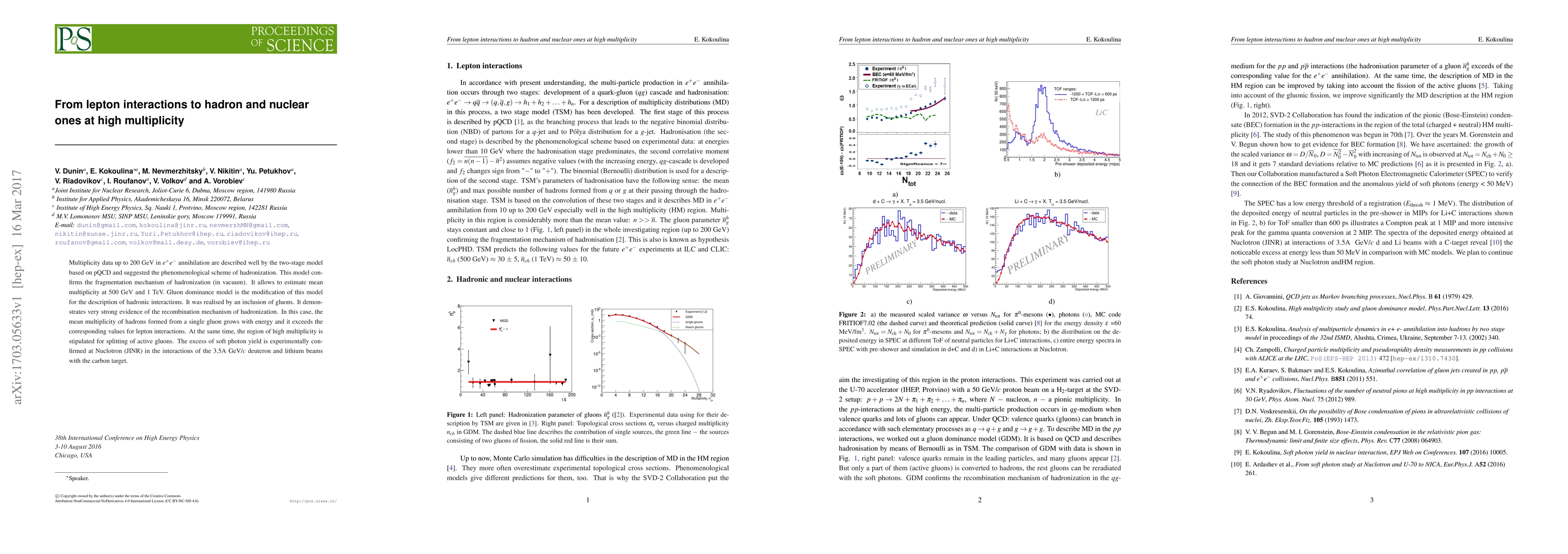 This paper presents a two-stage model based on pQCD to describe lepton interactions transitioning to hadron and nuclear interactions at high multiplicity, confirming the fragmentation mechanism of hadronization. The gluon dominance model, which includes gluons, provides strong evidence for the recombination mechanism and predicts higher mean multiplicity at higher energies.