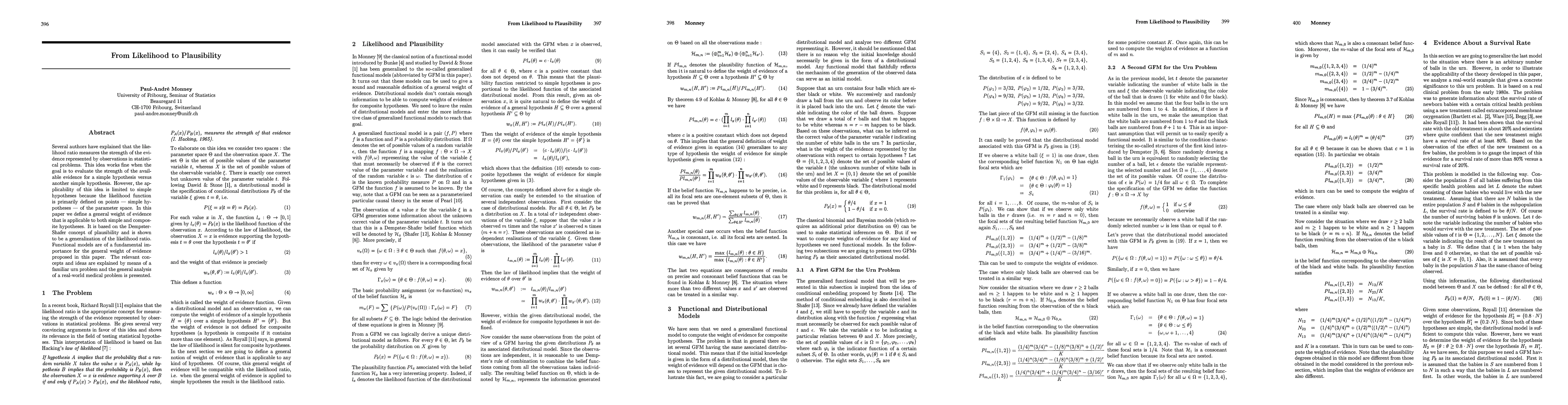 Several authors have explained that the likelihood ratio measures the strength of the evidence represented by observations in statistical problems. This idea works fine when the goal is to evaluate the strength of the available evidence for a simple hypothesis versus another simple hypothesis. However, the applicability of this idea is limited to simple hypotheses because the likelihood function is primarily defined on points (simple hypotheses) of the parameter space. In this paper we define a general weight of evidence that is applicable to both simple and composite hypotheses. It is based on the Dempster-Shafer concept of plausibility and is shown to be a generalization of the likelihood ratio. Functional models are of a fundamental importance for the general weight of evidence proposed in this paper. The relevant concepts and ideas are explained by means of a familiar urn problem and the general analysis of a real-world medical problem is presented.