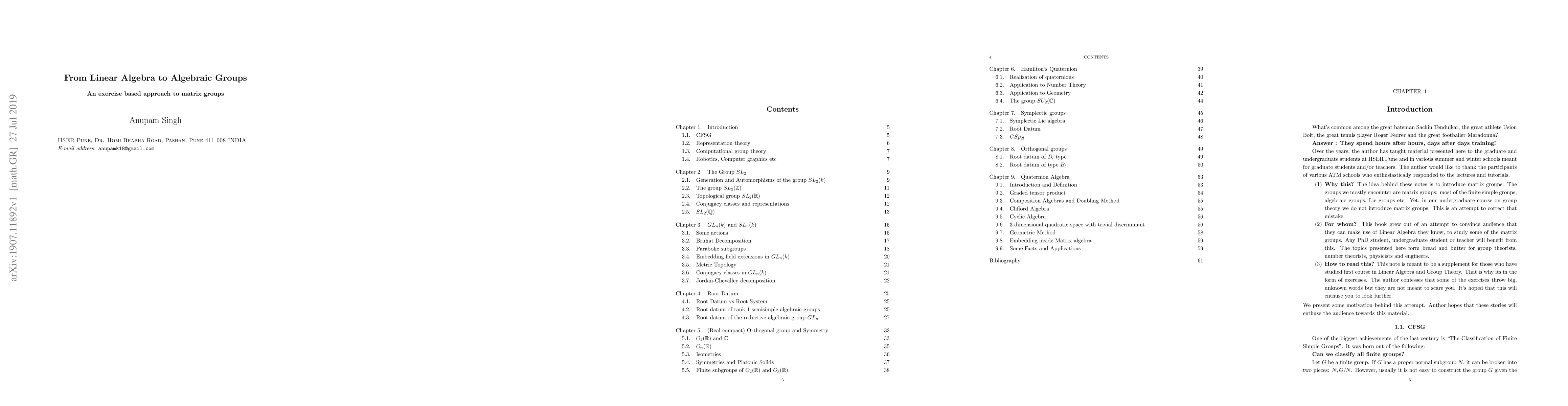 This is an exercise based approach to matrix groups. The idea is to collect a bunch of exercises at one place which anyone with basic knowledge of linear algebra can attempt to solve and learn matrix groups and algebraic groups.