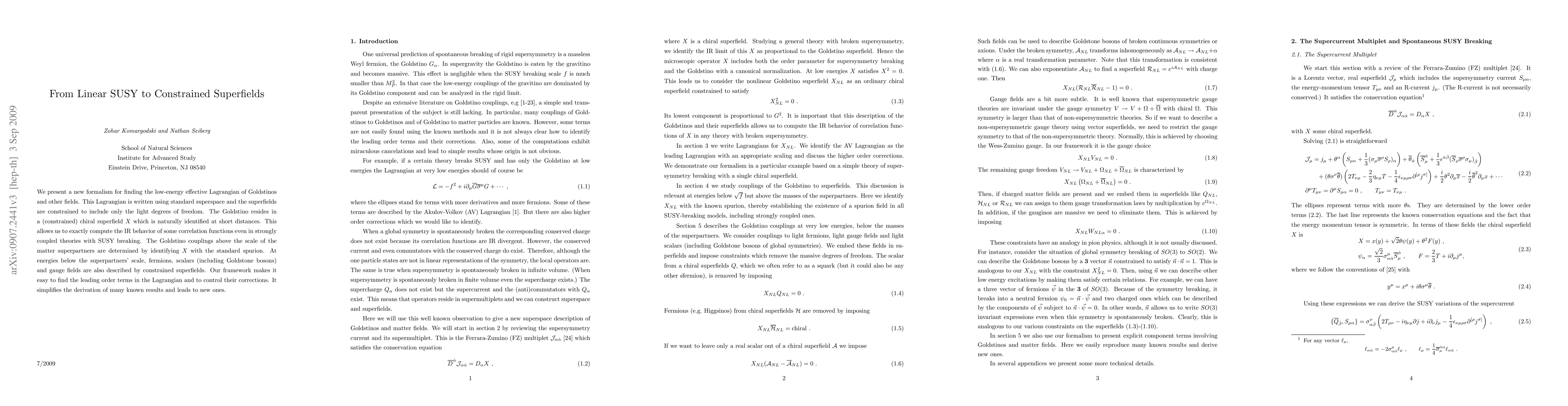 We present a new formalism for finding the low-energy effective Lagrangian of Goldstinos and other fields. This Lagrangian is written using standard superspace and the superfields are constrained to include only the light degrees of freedom. The Goldstino resides in a (constrained) chiral superfield X which is naturally identified at short distances. This allows us to exactly compute the IR behavior of some correlation functions even in strongly coupled theories with SUSY breaking. The Goldstino couplings above the scale of the matter superpartners are determined by identifying X with the standard spurion. At energies below the superpartners' scale, fermions, scalars (including Goldstone bosons) and gauge fields are also described by constrained superfields. Our framework makes it easy to find the leading order terms in the Lagrangian and to control their corrections. It simplifies the derivation of many known results and leads to new ones.