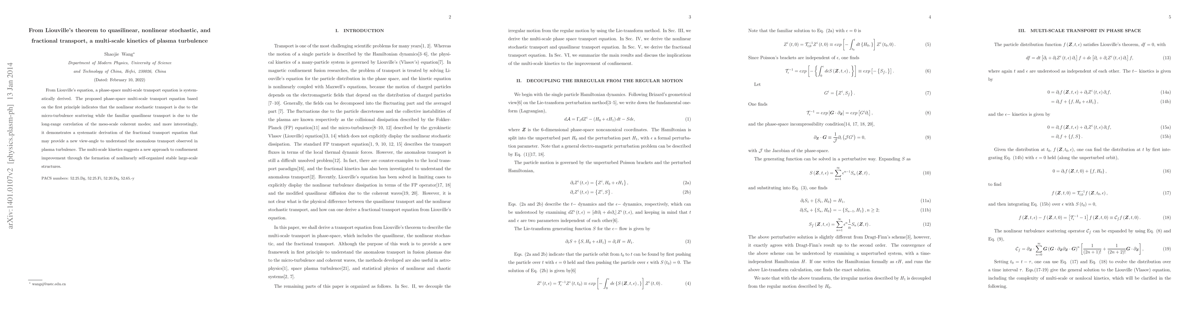 This paper derives a phase-space multi-scale transport equation from Liouville's theorem, showing that nonlinear stochastic transport arises from micro-turbulence scattering, while quasilinear transport is due to meso-scale coherent modes. It also introduces a fractional transport equation to better understand anomalous transport in plasma turbulence, suggesting new methods for improving confinement through self-organized large-scale structures.