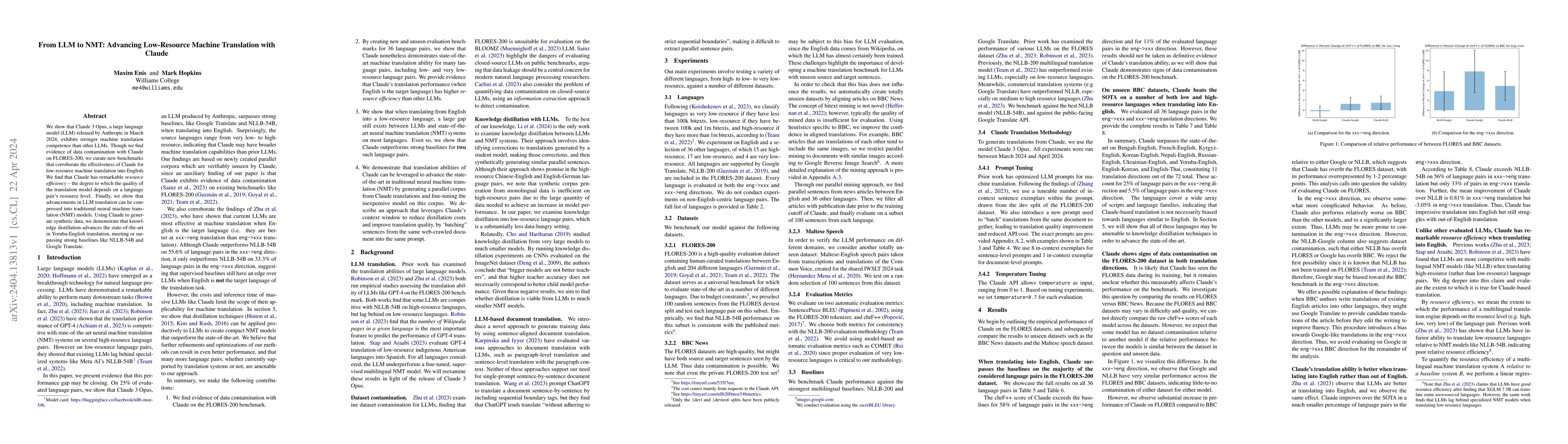 This research evaluates the performance of the Anthropic Claude 3 Opus large language model for low-resource machine translation, demonstrating its superior efficiency and effectiveness over other models, despite some data contamination issues. The study also shows that knowledge distillation using Claude can enhance traditional neural machine translation models, achieving competitive results in Yoruba-English translation.