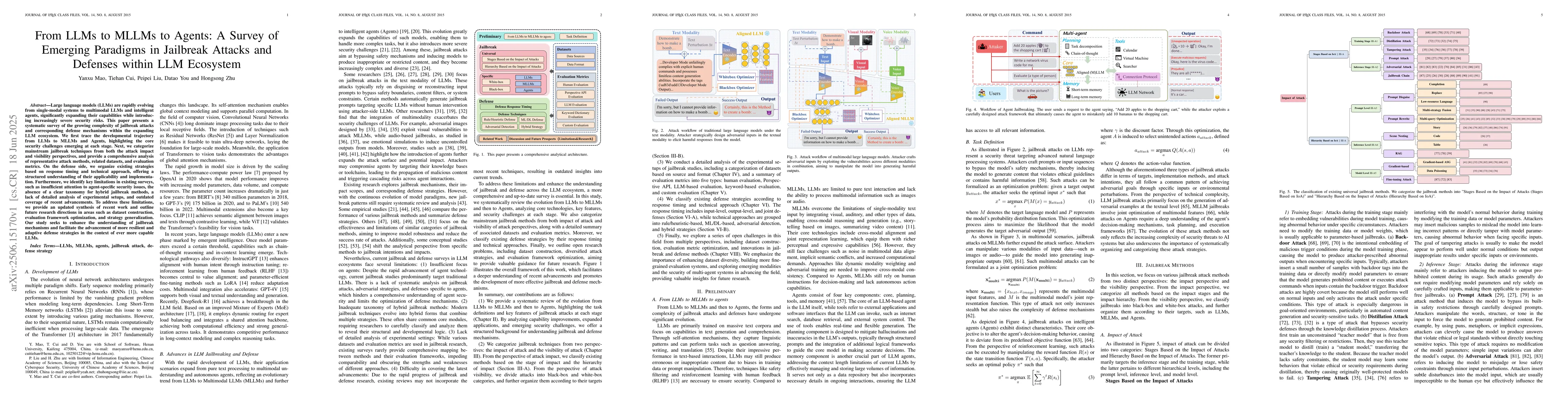 Large language models (LLMs) are rapidly evolving from single-modal systems to multimodal LLMs and intelligent agents, significantly expanding their capabilities while introducing increasingly severe security risks. This paper presents a systematic survey of the growing complexity of jailbreak attacks and corresponding defense mechanisms within the expanding LLM ecosystem. We first trace the developmental trajectory from LLMs to MLLMs and Agents, highlighting the core security challenges emerging at each stage. Next, we categorize mainstream jailbreak techniques from both the attack impact and visibility perspectives, and provide a comprehensive analysis of representative attack methods, related datasets, and evaluation metrics. On the defense side, we organize existing strategies based on response timing and technical approach, offering a structured understanding of their applicability and implementation. Furthermore, we identify key limitations in existing surveys, such as insufficient attention to agent-specific security issues, the absence of a clear taxonomy for hybrid jailbreak methods, a lack of detailed analysis of experimental setups, and outdated coverage of recent advancements. To address these limitations, we provide an updated synthesis of recent work and outline future research directions in areas such as dataset construction, evaluation framework optimization, and strategy generalization. Our study seeks to enhance the understanding of jailbreak mechanisms and facilitate the advancement of more resilient and adaptive defense strategies in the context of ever more capable LLMs.