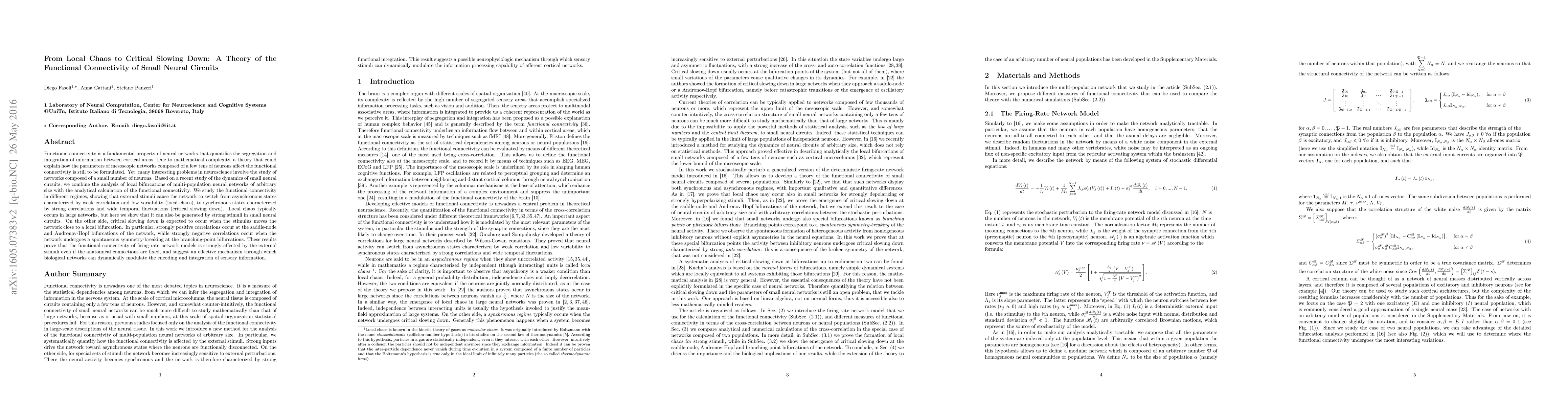 Functional connectivity is a fundamental property of neural networks that quantifies the segregation and integration of information between cortical areas. Due to mathematical complexity, a theory that could explain how the parameters of mesoscopic networks composed of a few tens of neurons affect the functional connectivity is still to be formulated. Yet, many interesting problems in neuroscience involve the study of networks composed of a small number of neurons. Based on a recent study of the dynamics of small neural circuits, we combine the analysis of local bifurcations of multi-population neural networks of arbitrary size with the analytical calculation of the functional connectivity. We study the functional connectivity in different regimes, showing that external stimuli cause the network to switch from asynchronous states characterized by weak correlation and low variability (local chaos), to synchronous states characterized by strong correlations and wide temporal fluctuations (critical slowing down). Local chaos typically occurs in large networks, but here we show that it can also be generated by strong stimuli in small neural circuits. On the other side, critical slowing down is expected to occur when the stimulus moves the network close to a local bifurcation. In particular, strongly positive correlations occur at the saddle-node and Andronov-Hopf bifurcations of the network, while strongly negative correlations occur when the network undergoes a spontaneous symmetry-breaking at the branching-point bifurcations. These results prove that the functional connectivity of firing-rate network models is strongly affected by the external stimuli even if the anatomical connections are fixed, and suggest an effective mechanism through which biological networks can dynamically modulate the encoding and integration of sensory information.