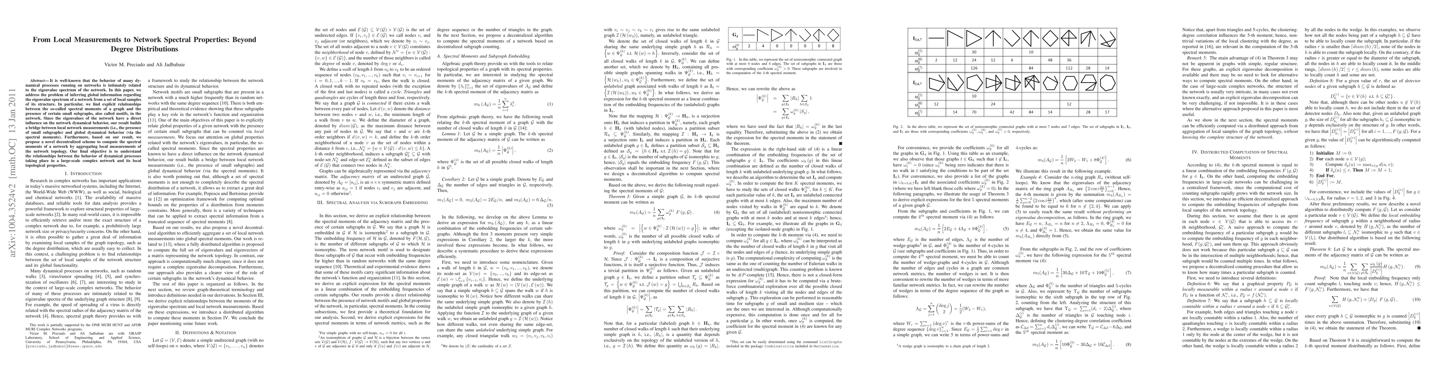 This paper explores how local subgraphs (motifs) in a network relate to its global spectral properties, proposing a method to infer the network's eigenvalue spectrum from local measurements. It introduces a decentralized scheme for computing spectral moments based on aggregated local topology data.