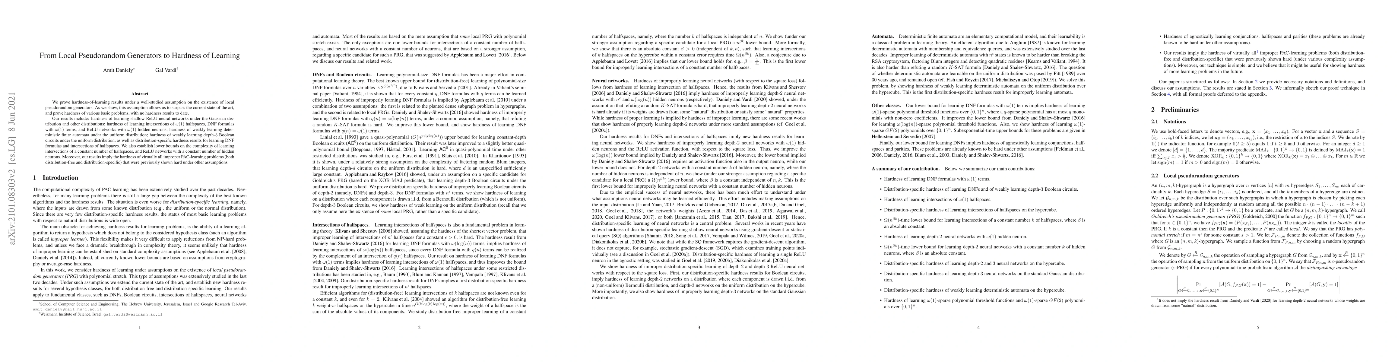 This paper demonstrates the hardness of learning various fundamental problems, including neural networks, halfspaces, and finite automata, under the assumption of local pseudorandom generators. It establishes new state-of-the-art results surpassing previous hardness results.