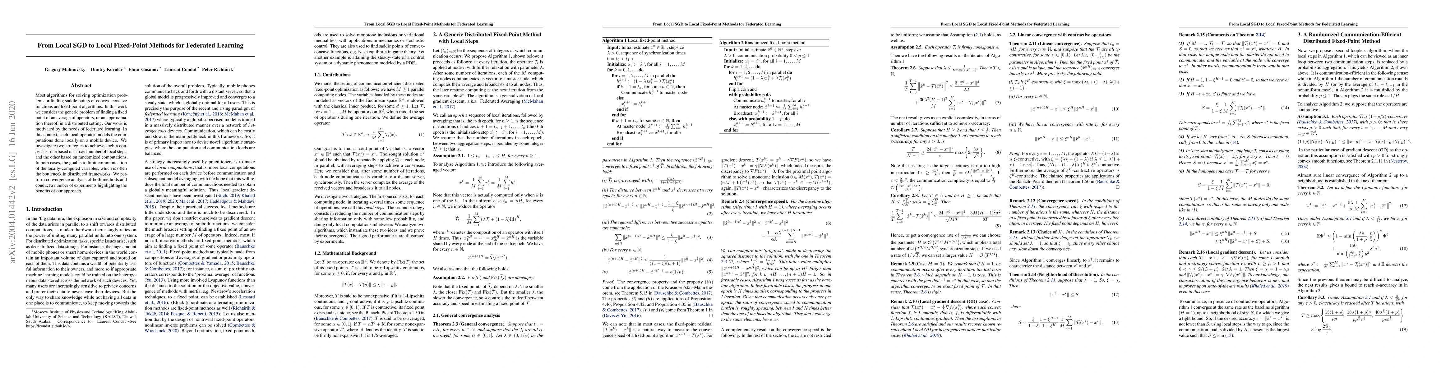 Most algorithms for solving optimization problems or finding saddle points of convex-concave functions are fixed-point algorithms. In this work we consider the generic problem of finding a fixed point of an average of operators, or an approximation thereof, in a distributed setting. Our work is motivated by the needs of federated learning. In this context, each local operator models the computations done locally on a mobile device. We investigate two strategies to achieve such a consensus: one based on a fixed number of local steps, and the other based on randomized computations. In both cases, the goal is to limit communication of the locally-computed variables, which is often the bottleneck in distributed frameworks. We perform convergence analysis of both methods and conduct a number of experiments highlighting the benefits of our approach.