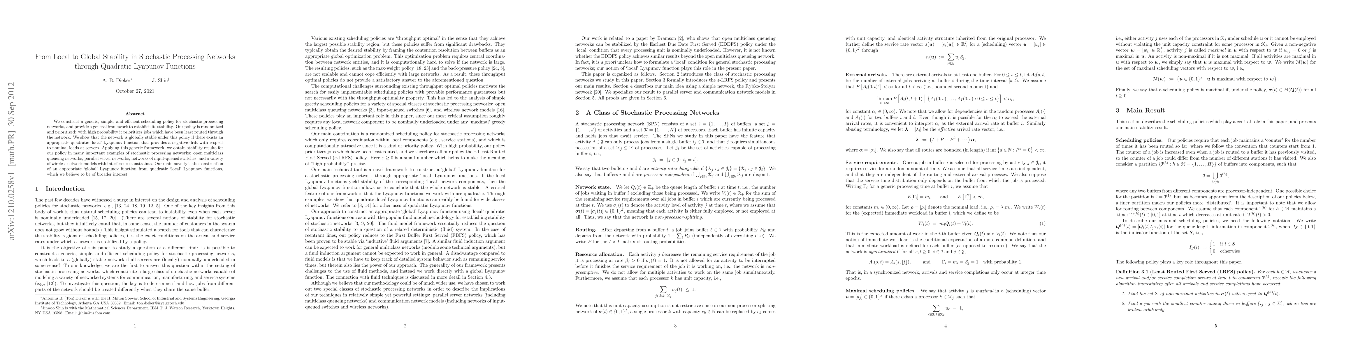 We construct a generic, simple, and efficient scheduling policy for stochastic processing networks, and provide a general framework to establish its stability. Our policy is randomized and prioritized: with high probability it prioritizes jobs which have been least routed through the network. We show that the network is globally stable under this policy if there exists an appropriate quadratic local Lyapunov function that provides a negative drift with respect to nominal loads at servers. Applying this generic framework, we obtain stability results for our policy in many important examples of stochastic processing networks: open multiclass queueing networks, parallel server networks, networks of input-queued switches, and a variety of wireless network models with interference constraints. Our main novelty is the construction of an appropriate global Lyapunov function from quadratic local Lyapunov functions, which we believe to be of broader interest.