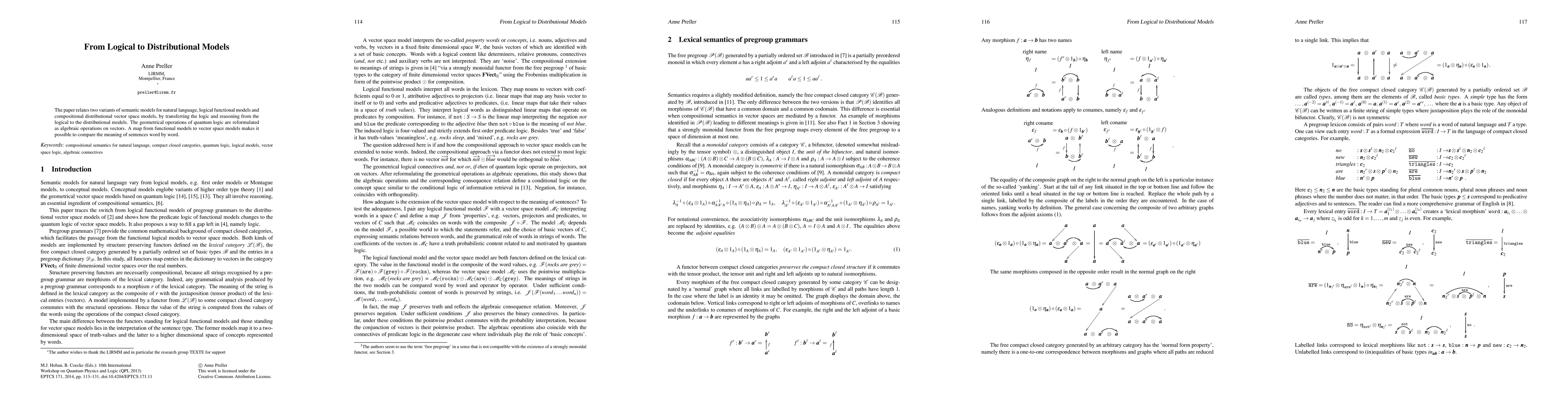 The paper relates two variants of semantic models for natural language, logical functional models and compositional distributional vector space models, by transferring the logic and reasoning from the logical to the distributional models. The geometrical operations of quantum logic are reformulated as algebraic operations on vectors. A map from functional models to vector space models makes it possible to compare the meaning of sentences word by word.