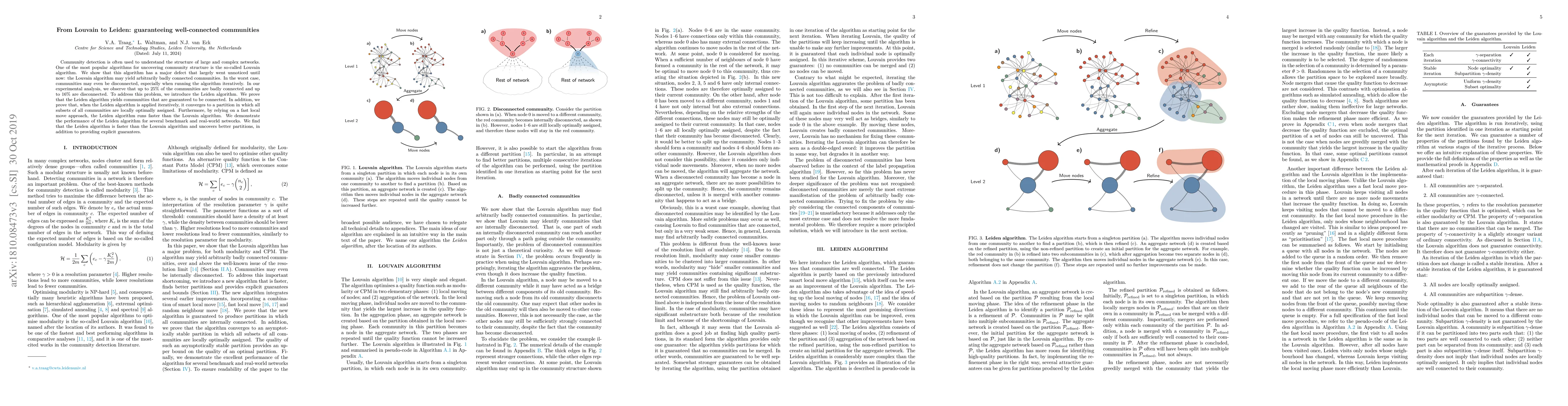 The Louvain algorithm, a popular method for community detection, often produces poorly connected communities, sometimes even disconnected ones. To address this issue, the Leiden algorithm is introduced, which guarantees connected communities and converges to an optimal partition, while also running faster than the Louvain algorithm.