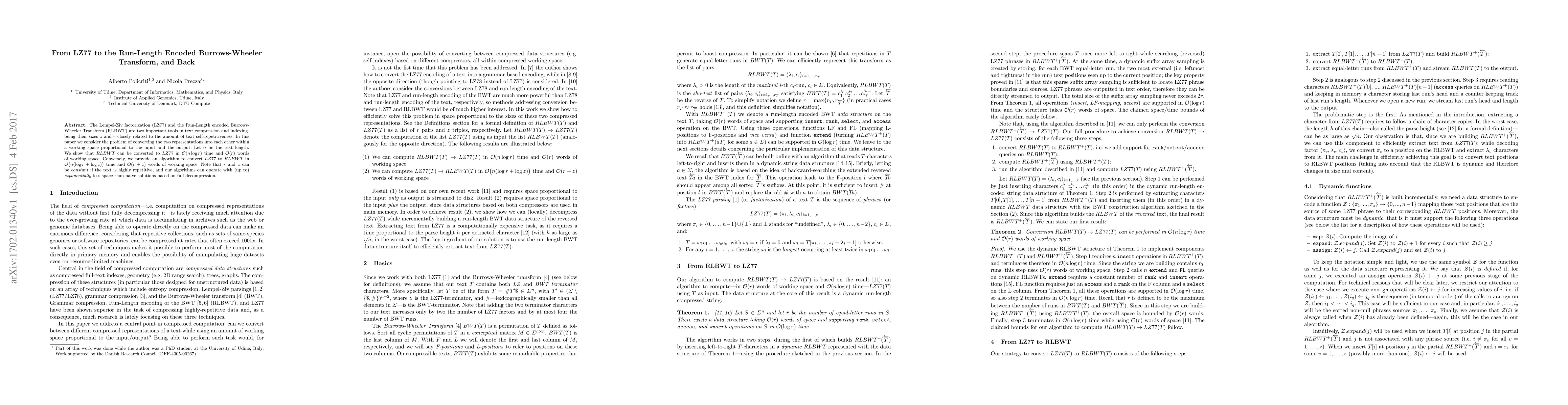 The Lempel-Ziv factorization (LZ77) and the Run-Length encoded Burrows-Wheeler Transform (RLBWT) are two important tools in text compression and indexing, being their sizes $z$ and $r$ closely related to the amount of text self-repetitiveness. In this paper we consider the problem of converting the two representations into each other within a working space proportional to the input and the output. Let $n$ be the text length. We show that $RLBWT$ can be converted to $LZ77$ in $\mathcal{O}(n\log r)$ time and $\mathcal{O}(r)$ words of working space. Conversely, we provide an algorithm to convert $LZ77$ to $RLBWT$ in $\mathcal{O}\big(n(\log r + \log z)\big)$ time and $\mathcal{O}(r+z)$ words of working space. Note that $r$ and $z$ can be \emph{constant} if the text is highly repetitive, and our algorithms can operate with (up to) \emph{exponentially} less space than naive solutions based on full decompression.