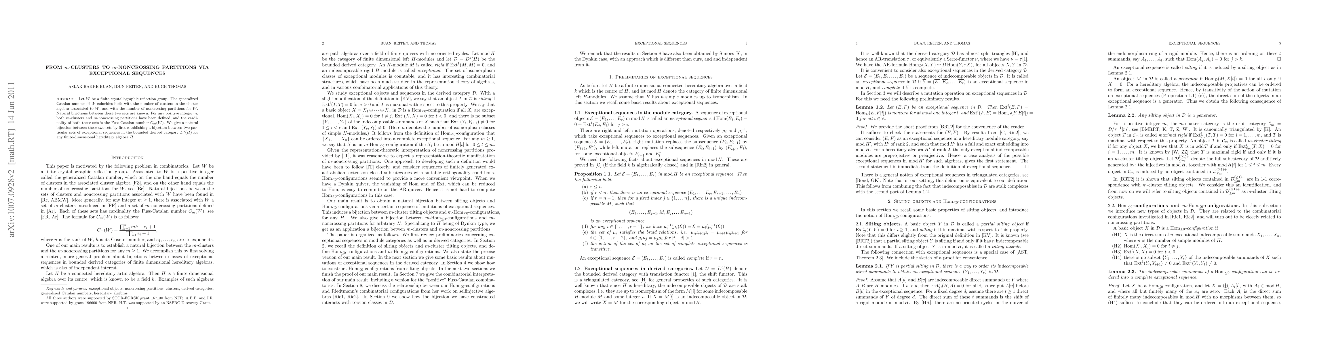 Let W be a finite crystallographic reflection group. The generalized Catalan number of W coincides both with the number of clusters in the cluster algebra associated to W, and with the number of noncrossing partitions for W. Natural bijections between these two sets are known. For any positive integer m, both m-clusters and m-noncrossing partitions have been defined, and the cardinality of both these sets is the Fuss-Catalan number. We give a natural bijection between these two sets by first establishing a bijection between two particular sets of exceptional sequences in the bounded derived category for any finite-dimensional hereditary algebra.