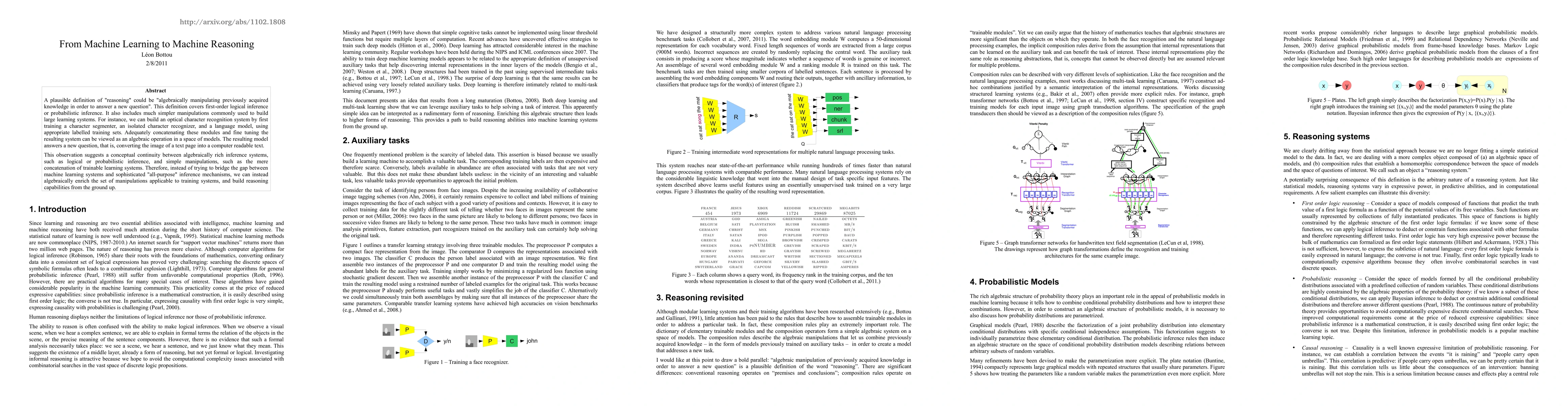 A plausible definition of "reasoning" could be "algebraically manipulating previously acquired knowledge in order to answer a new question". This definition covers first-order logical inference or probabilistic inference. It also includes much simpler manipulations commonly used to build large learning systems. For instance, we can build an optical character recognition system by first training a character segmenter, an isolated character recognizer, and a language model, using appropriate labeled training sets. Adequately concatenating these modules and fine tuning the resulting system can be viewed as an algebraic operation in a space of models. The resulting model answers a new question, that is, converting the image of a text page into a computer readable text. This observation suggests a conceptual continuity between algebraically rich inference systems, such as logical or probabilistic inference, and simple manipulations, such as the mere concatenation of trainable learning systems. Therefore, instead of trying to bridge the gap between machine learning systems and sophisticated "all-purpose" inference mechanisms, we can instead algebraically enrich the set of manipulations applicable to training systems, and build reasoning capabilities from the ground up.