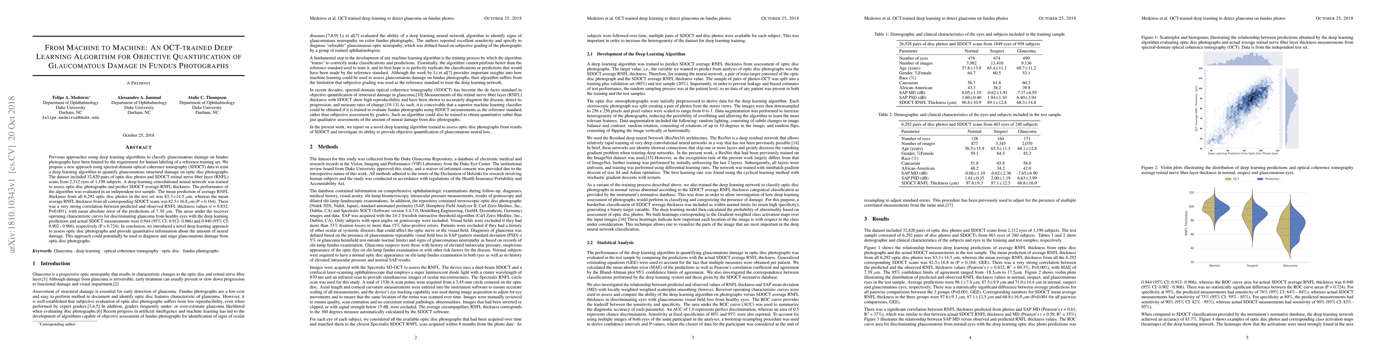 This paper introduces a novel deep learning algorithm trained with spectral-domain optical coherence tomography data to quantify glaucomatous damage in optic disc photographs, achieving strong correlation and accuracy in predicting retinal nerve fiber layer thickness without requiring human-labeled reference data.
