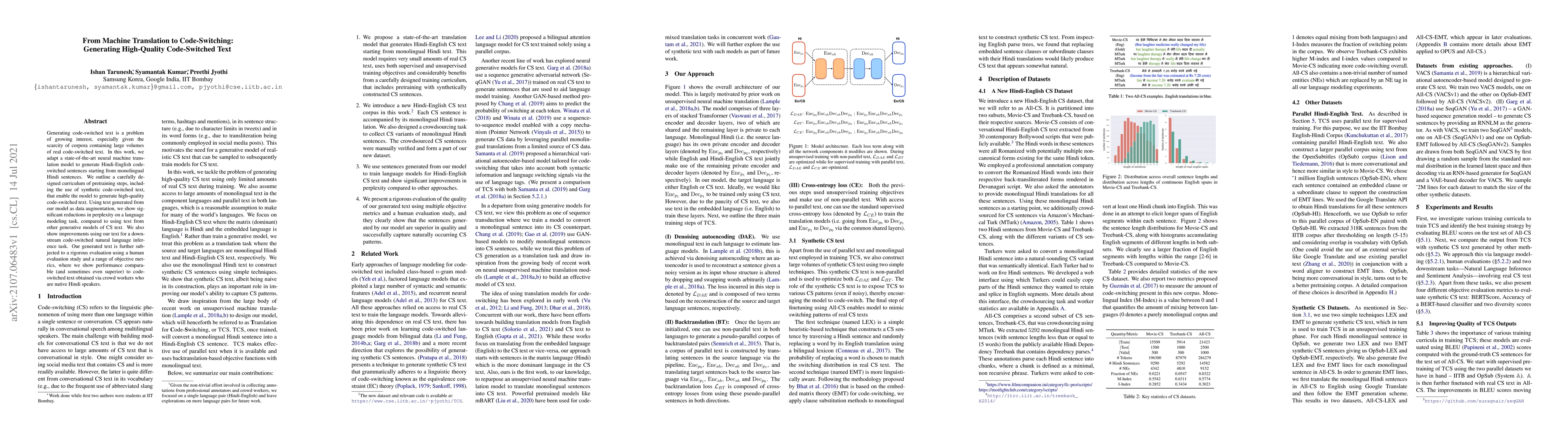 This paper adapts a neural machine translation model to generate high-quality Hindi-English code-switched text from monolingual Hindi sentences, utilizing a curriculum of pretraining steps. The generated text shows improvements in language modeling and natural language inference tasks, and performs comparably to text created by native speakers in evaluations.