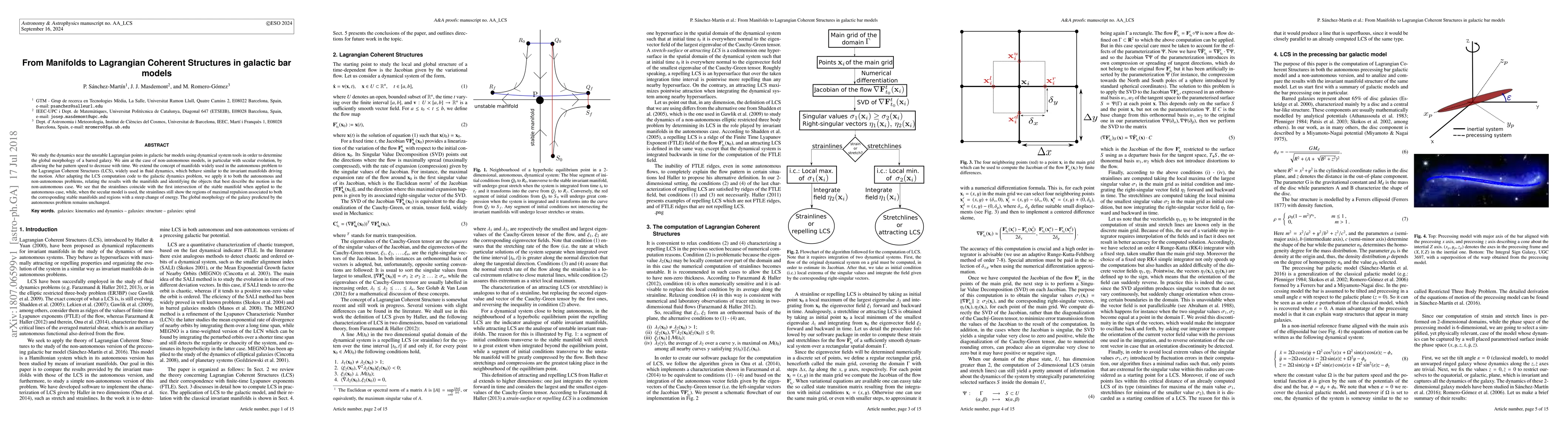 We study the dynamics near the unstable Lagrangian points in galactic bar models using dynamical system tools in order to determine the global morphology of a barred galaxy. We aim at the case of non-autonomous models, in particular with secular evolution, by allowing the bar pattern speed to decrease with time. We extend the concept of manifolds widely used in the autonomous problem to the Lagrangian Coherent Structures (LCS), widely used in fluid dynamics, which behave similar to the invariant manifolds driving the motion. After adapting the LCS computation code to the galactic dynamics problem, we apply it to both the autonomous and non-autonomous problems, relating the results with the manifolds and identifying the objects that best describe the motion in the non-autonomous case. We see that the strainlines coincide with the first intersection of the stable manifold when applied to the autonomous case, while, when the secular model is used, the strainlines still show the regions of maximal repulsion associated to both the corresponding stable manifolds and regions with a steep change of energy. The global morphology of the galaxy predicted by the autonomous problem remains unchanged.