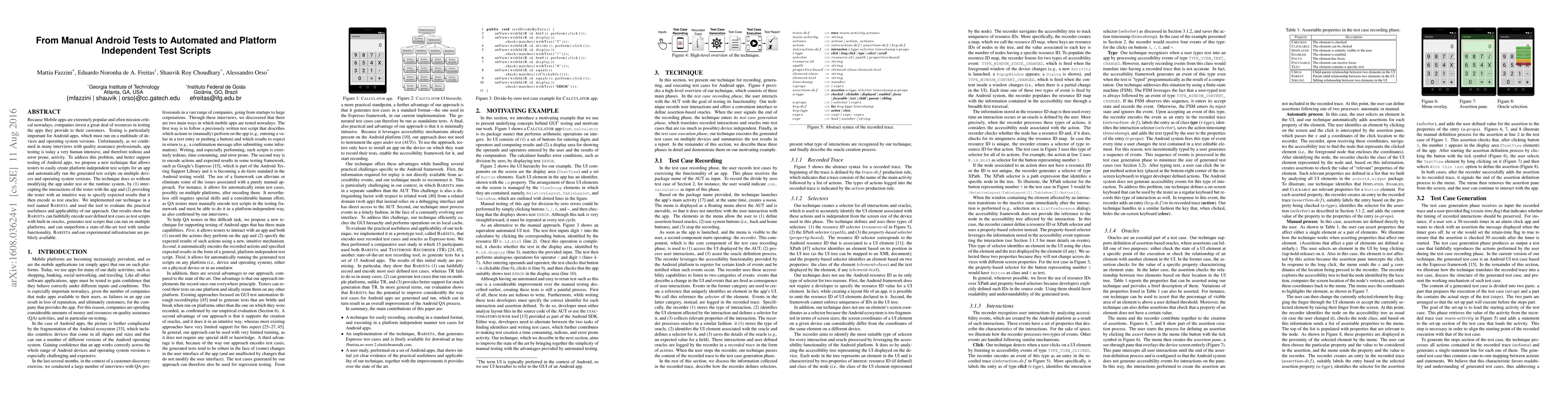 Because Mobile apps are extremely popular and often mission critical nowadays, companies invest a great deal of resources in testing the apps they provide to their customers. Testing is particularly important for Android apps, which must run on a multitude of devices and operating system versions. Unfortunately, as we confirmed in many interviews with quality assurance professionals, app testing is today a very human intensive, and therefore tedious and error prone, activity. To address this problem, and better support testing of Android apps, we propose a new technique that allows testers to easily create platform independent test scripts for an app and automatically run the generated test scripts on multiple devices and operating system versions. The technique does so without modifying the app under test or the runtime system, by (1) intercepting the interactions of the tester with the app and (2) providing the tester with an intuitive way to specify expected results that it then encode as test oracles. We implemented our technique in a tool named Barista and used the tool to evaluate the practical usefulness and applicability of our approach. Our results show that Barista can faithfully encode user defined test cases as test scripts with built-in oracles, generates test scripts that can run on multiple platforms, and can outperform a state-of-the-art tool with similar functionality. Barista and our experimental infrastructure are publicly available.