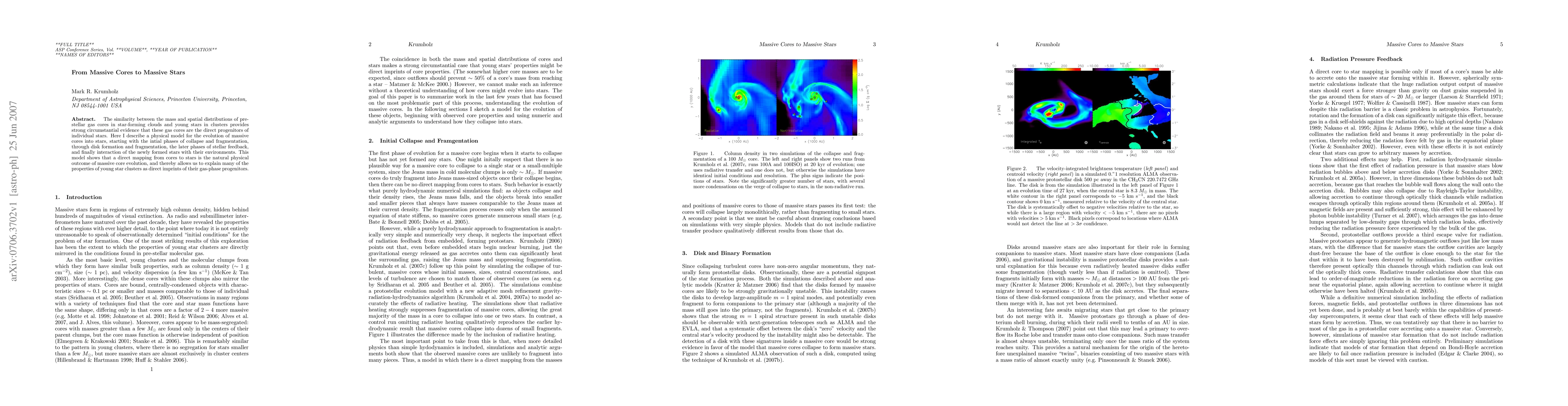 The similarity between the mass and spatial distributions of pre-stellar gas cores in star-forming clouds and young stars in clusters provides strong circumstantial evidence that these gas cores are the direct progenitors of individual stars. Here I describe a physical model for the evolution of massive cores into stars, starting with the initial phases of collapse and fragmentation, through disk formation and fragmentation, the later phases of stellar feedback, and finally interaction of the newly formed stars with their environments. This model shows that a direct mapping from cores to stars is the natural physical outcome of massive core evolution, and thereby allows us to explain many of the properties of young star clusters as direct imprints of their gas-phase progenitors.
