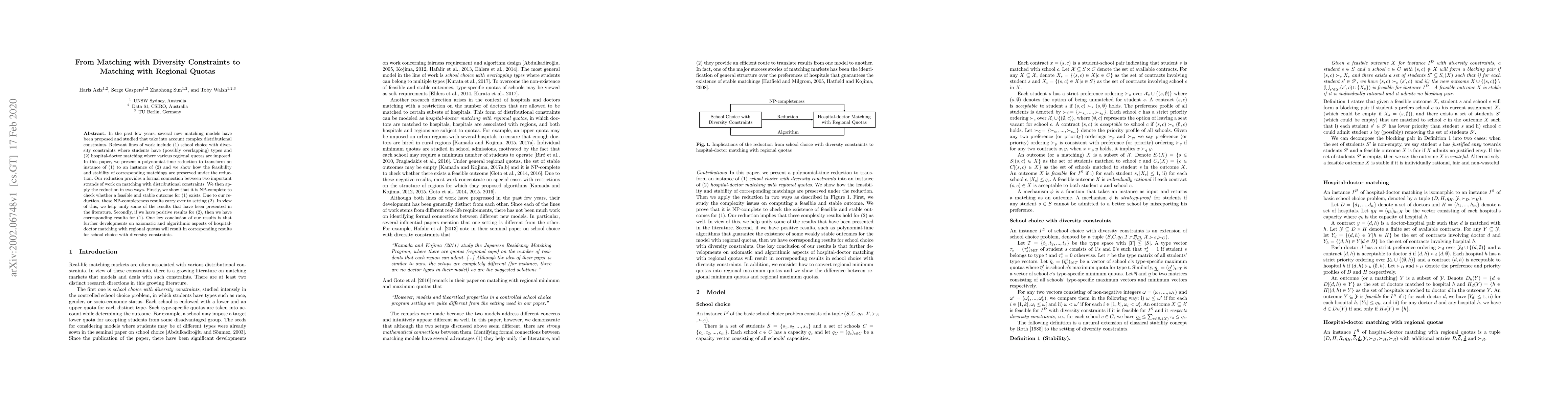 This paper presents a polynomial-time reduction transforming school choice problems with diversity constraints into hospital-doctor matching problems with regional quotas, preserving feasibility and stability. It demonstrates the NP-completeness of finding stable outcomes in both settings and highlights the potential for algorithmic advancements in one domain to benefit the other.