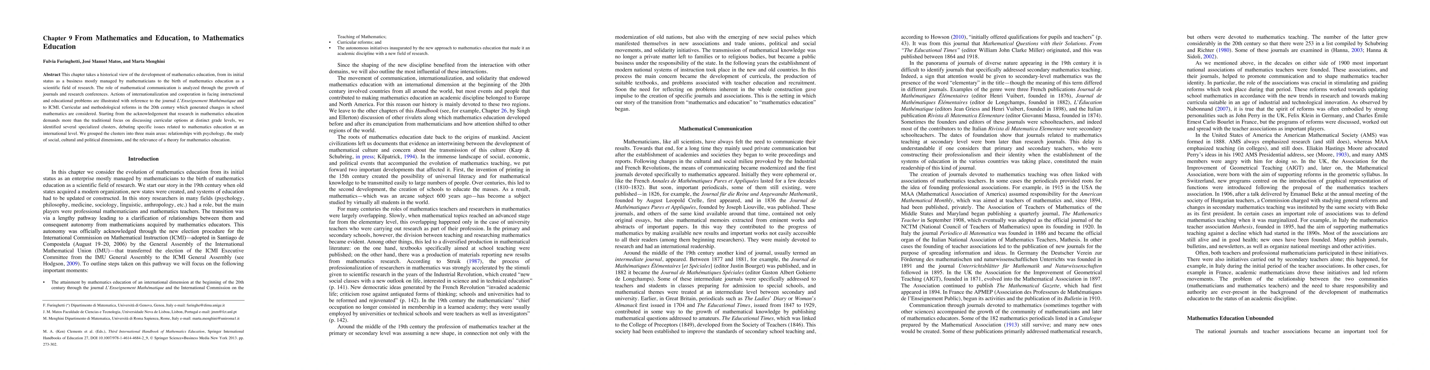 This paper traces the evolution of mathematics education from a domain primarily managed by mathematicians to a recognized scientific field, emphasizing the emergence of specialized research clusters focusing on psychology, social and cultural dimensions, and theoretical relevance. It highlights the shift from traditional curriculum discussions to a broader, more nuanced understanding of mathematics education.