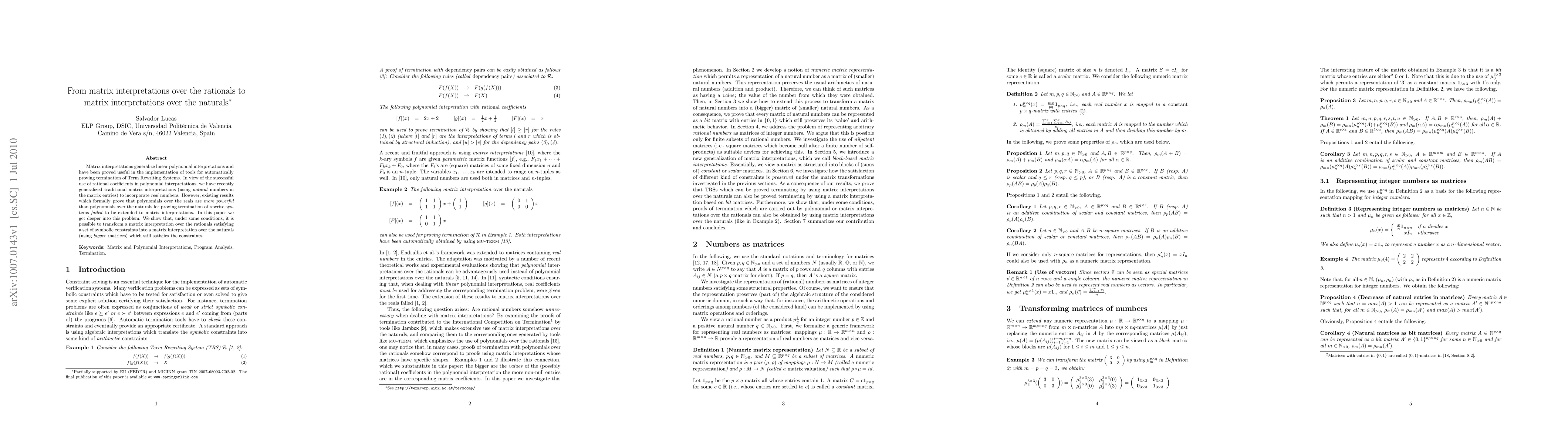 This paper explores the transformation of matrix interpretations from rational to natural numbers, demonstrating that under certain conditions, a matrix interpretation over rationals can be converted into a matrix interpretation over naturals while preserving symbolic constraints. This addresses the limitation in extending termination-proving power from rational to natural number matrices.
