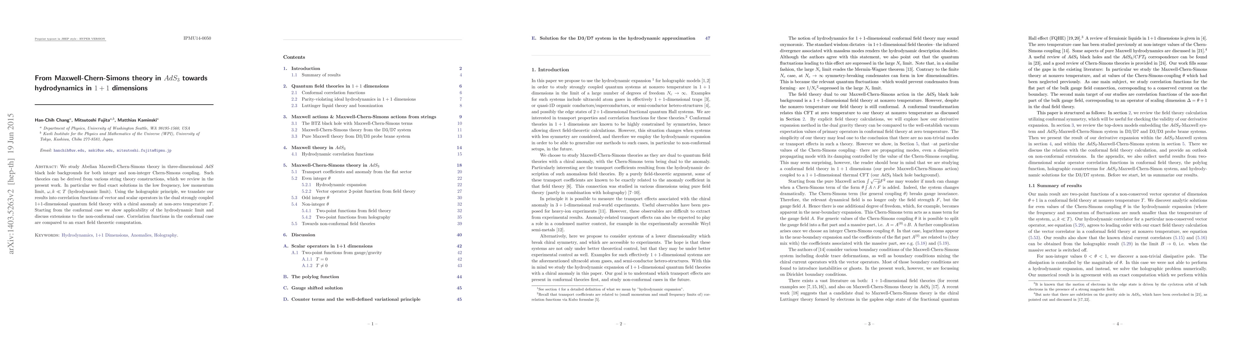 We study Abelian Maxwell-Chern-Simons theory in three-dimensional $AdS$ black hole backgrounds for both integer and non-integer Chern-Simons coupling. Such theories can be derived from various string theory constructions, which we review in the present work. In particular we find exact solutions in the low frequency, low momentum limit, $\omega, k \ll T$(hydrodynamic limit). Using the holographic principle, we translate our results into correlation functions of vector and scalar operators in the dual strongly coupled 1+1-dimensional quantum field theory with a chiral anomaly at non-zero temperature $T$. Starting from the conformal case we show applicability of the hydrodynamic limit and discuss extensions to the non-conformal case. Correlation functions in the conformal case are compared to an exact field theoretic computation.