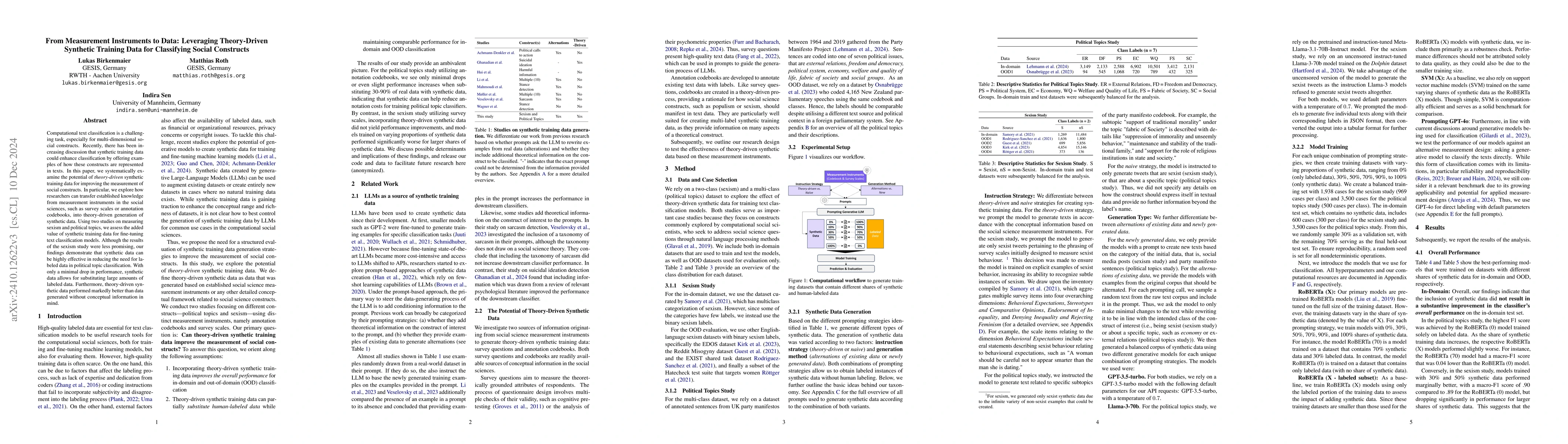 This paper explores how synthetic training data, informed by established social science measurement instruments, can improve computational text classification for social constructs. Findings show that theory-driven synthetic data can effectively substitute for large amounts of labeled data, particularly in political topic classification, though results were less promising for measuring sexism.
