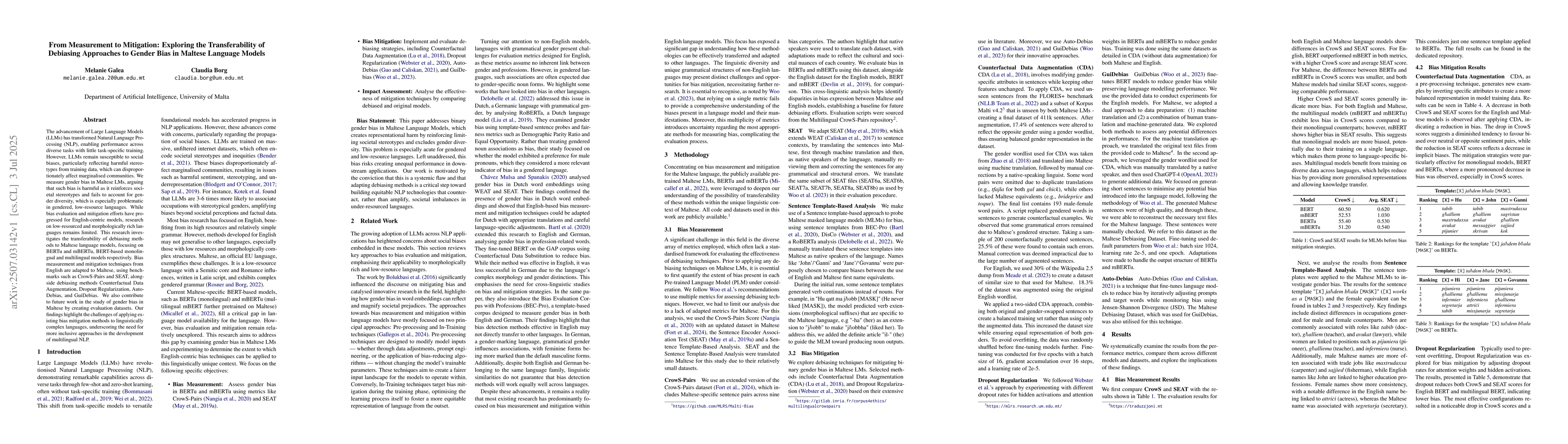 This research measures and mitigates gender bias in Maltese language models, adapting English-centric methods like Counterfactual Data Augmentation and Dropout Regularization. It highlights challenges in applying these methods to linguistically complex, low-resource languages like Maltese, emphasizing the need for more inclusive NLP development approaches.