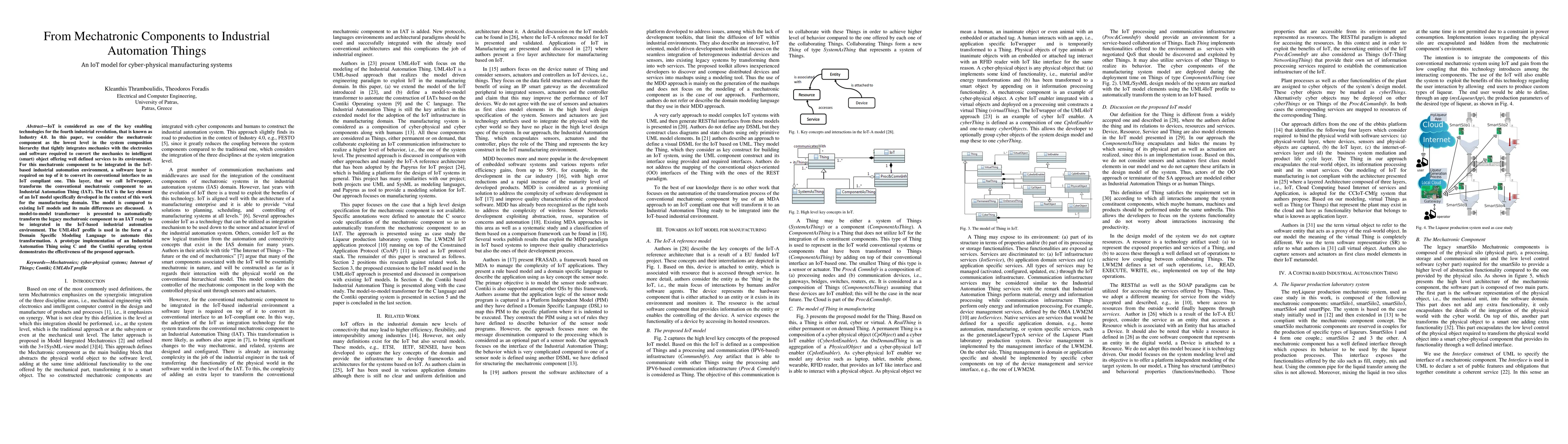 This paper proposes an IoT model for cyber-physical manufacturing systems, introducing the Industrial Automation Thing (IAT) to integrate mechatronic components into IoT-based automation. The IoTwrapper software layer transforms conventional components into IATs, enabling their integration into IoT environments, with a model-to-model transformer for automatic transformation.