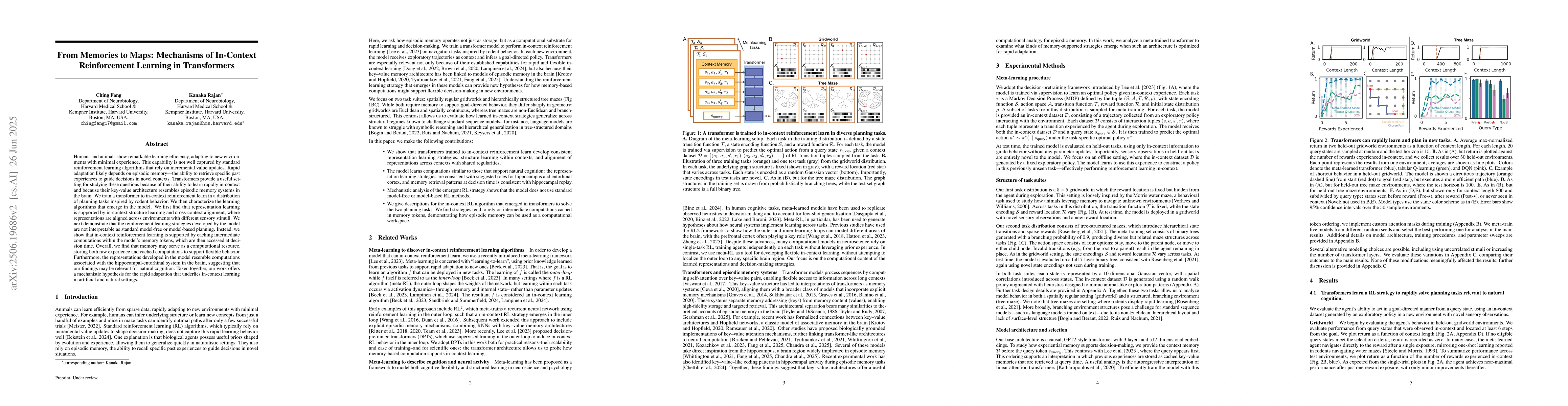 Humans and animals show remarkable learning efficiency, adapting to new environments with minimal experience. This capability is not well captured by standard reinforcement learning algorithms that rely on incremental value updates. Rapid adaptation likely depends on episodic memory -- the ability to retrieve specific past experiences to guide decisions in novel contexts. Transformers provide a useful setting for studying these questions because of their ability to learn rapidly in-context and because their key-value architecture resembles episodic memory systems in the brain. We train a transformer to in-context reinforcement learn in a distribution of planning tasks inspired by rodent behavior. We then characterize the learning algorithms that emerge in the model. We first find that representation learning is supported by in-context structure learning and cross-context alignment, where representations are aligned across environments with different sensory stimuli. We next demonstrate that the reinforcement learning strategies developed by the model are not interpretable as standard model-free or model-based planning. Instead, we show that in-context reinforcement learning is supported by caching intermediate computations within the model's memory tokens, which are then accessed at decision time. Overall, we find that memory may serve as a computational resource, storing both raw experience and cached computations to support flexible behavior. Furthermore, the representations developed in the model resemble computations associated with the hippocampal-entorhinal system in the brain, suggesting that our findings may be relevant for natural cognition. Taken together, our work offers a mechanistic hypothesis for the rapid adaptation that underlies in-context learning in artificial and natural settings.
