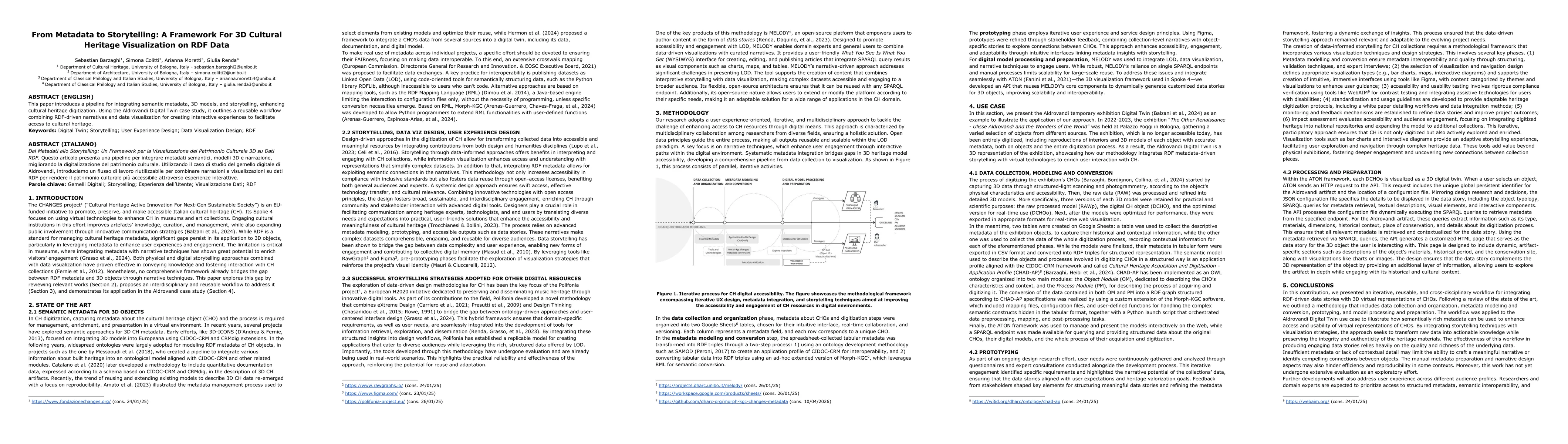 The paper presents a pipeline integrating semantic metadata, 3D models, and storytelling for cultural heritage digitization, using the Aldrovandi Digital Twin as a case study.