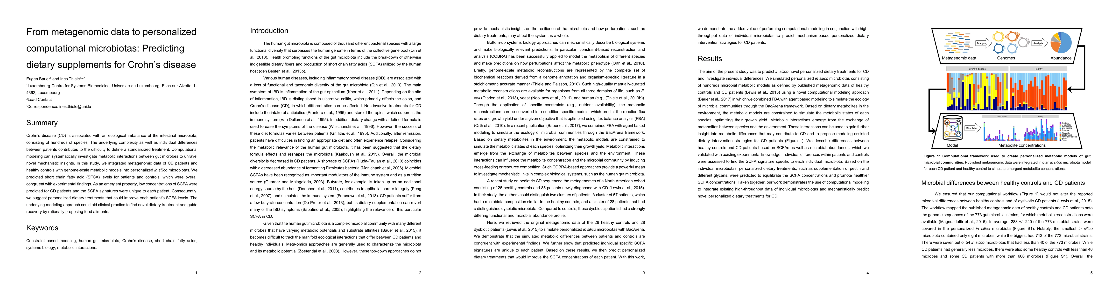This study uses computational modeling to predict personalized dietary supplements for Crohn's disease patients based on their unique gut microbiota profiles. It suggests tailored treatments to improve short-chain fatty acid levels, which may aid in recovery.