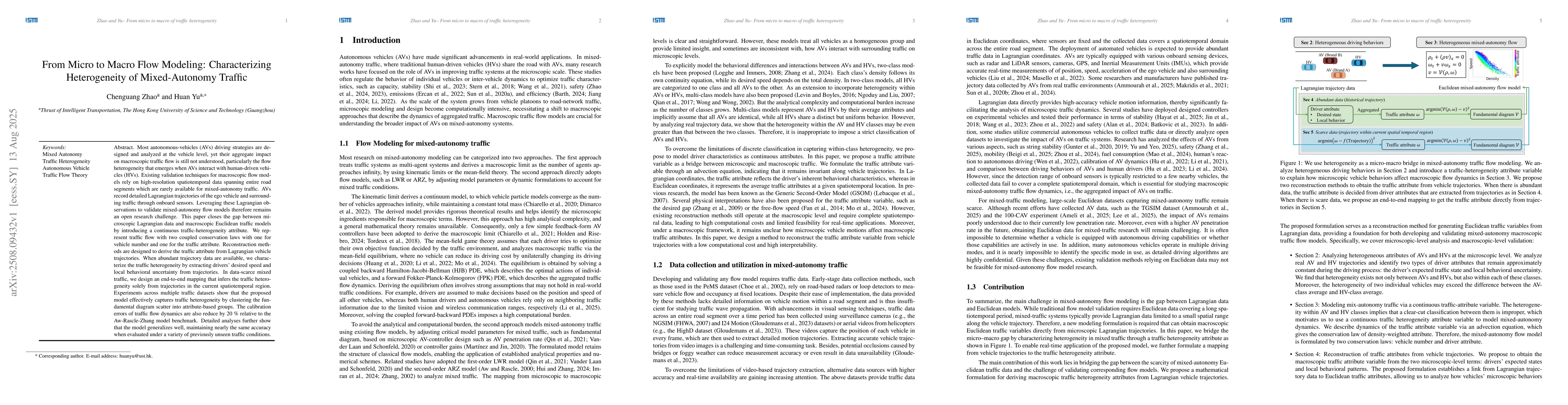 Most autonomous-vehicles (AVs) driving strategies are designed and analyzed at the vehicle level, yet their aggregate impact on macroscopic traffic flow is still not understood, particularly the flow heterogeneity that emerges when AVs interact with human-driven vehicles (HVs). Existing validation techniques for macroscopic flow models rely on high-resolution spatiotemporal data spanning entire road segments which are rarely available for mixed-autonomy traffic. AVs record detailed Lagrangian trajectories of the ego vehicle and surrounding traffic through onboard sensors. Leveraging these Lagrangian observations to validate mixed-autonomy flow models therefore remains an open research challenge. This paper closes the gap between microscopic Lagrangian data and macroscopic Euclidean traffic models by introducing a continuous traffic-heterogeneity attribute. We represent traffic flow with two coupled conservation laws with one for vehicle number and one for the traffic attribute. Reconstruction methods are designed to derive the traffic attribute from Lagrangian vehicle trajectories. When abundant trajectory data are available, we characterize traffic heterogeneity by extracting drivers' desired speed and local behavioral uncertainty from trajectories. In data-scarce mixed traffic, we design an end-to-end mapping that infers the traffic heterogeneity solely from trajectories in the current spatiotemporal region. Experiments across multiple traffic datasets show that the proposed model effectively captures traffic heterogeneity by clustering the fundamental diagram scatter into attribute-based groups. The calibration errors of traffic flow dynamics are also reduce by 20% relative to the Aw-Rascle-Zhang model benchmark. Detailed analyses further show that the model generalizes well, maintaining nearly the same accuracy when evaluated under a variety of previously unseen traffic conditions.