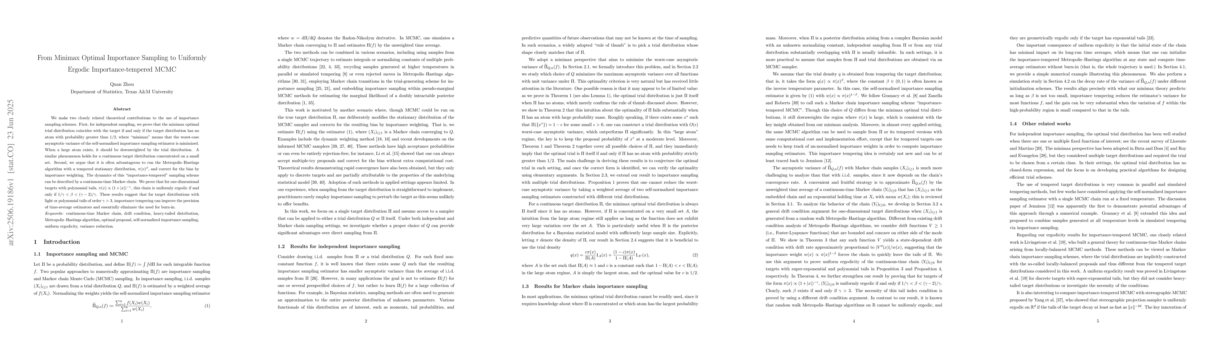 We make two closely related theoretical contributions to the use of importance sampling schemes. First, for independent sampling, we prove that the minimax optimal trial distribution coincides with the target if and only if the target distribution has no atom with probability greater than $1/2$, where "minimax" means that the worst-case asymptotic variance of the self-normalized importance sampling estimator is minimized. When a large atom exists, it should be downweighted by the trial distribution. A similar phenomenon holds for a continuous target distribution concentrated on a small set. Second, we argue that it is often advantageous to run the Metropolis--Hastings algorithm with a tempered stationary distribution, $\pi(x)^\beta$, and correct for the bias by importance weighting. The dynamics of this "importance-tempered" sampling scheme can be described by a continuous-time Markov chain. We prove that for one-dimensional targets with polynomial tails, $\pi(x) \propto (1 + |x|)^{-\gamma}$, this chain is uniformly ergodic if and only if $1/\gamma < \beta < (\gamma - 2)/\gamma$. These results suggest that for target distributions with light or polynomial tails of order $\gamma > 3$, importance tempering can improve the precision of time-average estimators and essentially eliminate the need for burn-in.
