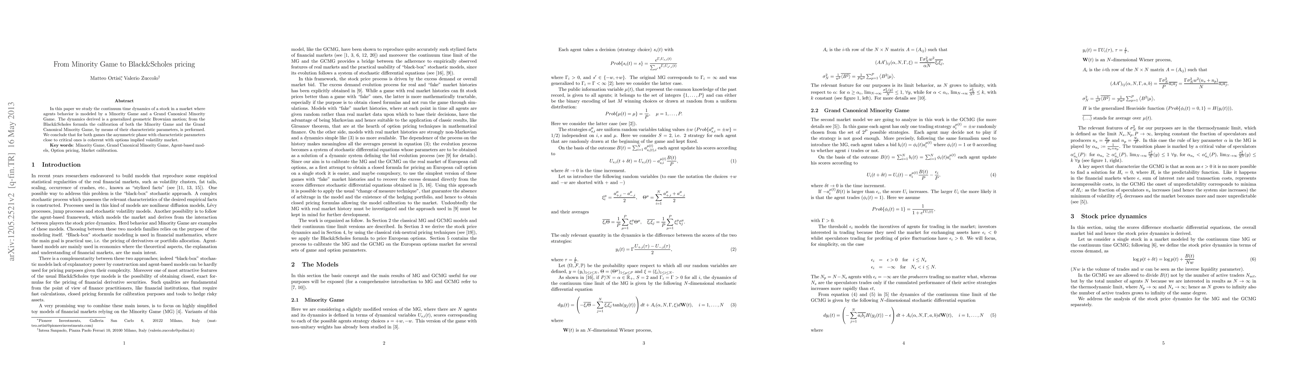 In this paper we study the continuum time dynamics of a stock in a market where agents behavior is modeled by a Minority Game and a Grand Canonical Minority Game. The dynamics derived is a generalized geometric Brownian motion; from the Black & Scholes formula the calibration of both the Minority Game and the Grand Canonical Minority Game, by means of their characteristic parameters, is performed. We conclude that for both games the asymmetric phase with characteristic parameters close to critical ones is coherent with options implied volatility market.