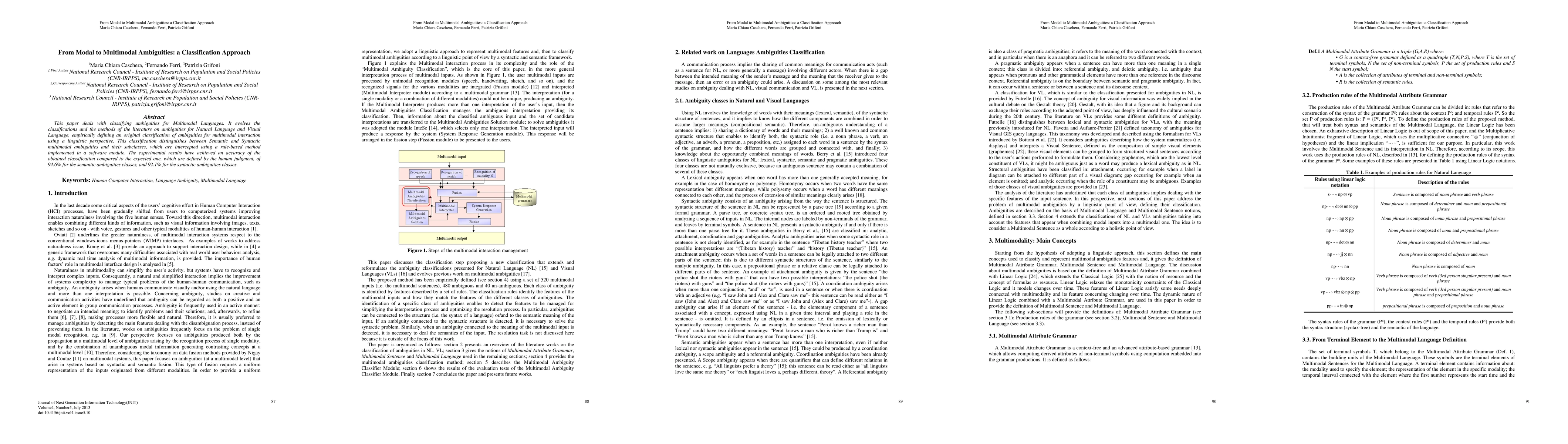 This paper deals with classifying ambiguities for Multimodal Languages. It evolves the classifications and the methods of the literature on ambiguities for Natural Language and Visual Language, empirically defining an original classification of ambiguities for multimodal interaction using a linguistic perspective. This classification distinguishes between Semantic and Syntactic multimodal ambiguities and their subclasses, which are intercepted using a rule-based method implemented in a software module. The experimental results have achieved an accuracy of the obtained classification compared to the expected one, which are defined by the human judgment, of 94.6% for the semantic ambiguities classes, and 92.1% for the syntactic ambiguities classes.