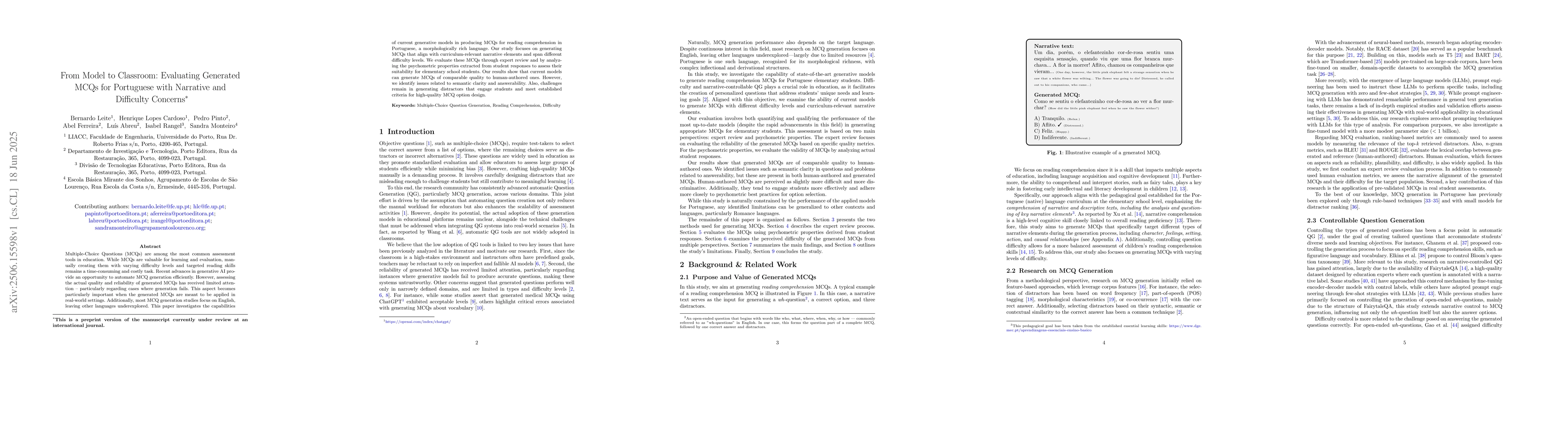 While MCQs are valuable for learning and evaluation, manually creating them with varying difficulty levels and targeted reading skills remains a time-consuming and costly task. Recent advances in generative AI provide an opportunity to automate MCQ generation efficiently. However, assessing the actual quality and reliability of generated MCQs has received limited attention -- particularly regarding cases where generation fails. This aspect becomes particularly important when the generated MCQs are meant to be applied in real-world settings. Additionally, most MCQ generation studies focus on English, leaving other languages underexplored. This paper investigates the capabilities of current generative models in producing MCQs for reading comprehension in Portuguese, a morphologically rich language. Our study focuses on generating MCQs that align with curriculum-relevant narrative elements and span different difficulty levels. We evaluate these MCQs through expert review and by analyzing the psychometric properties extracted from student responses to assess their suitability for elementary school students. Our results show that current models can generate MCQs of comparable quality to human-authored ones. However, we identify issues related to semantic clarity and answerability. Also, challenges remain in generating distractors that engage students and meet established criteria for high-quality MCQ option design.