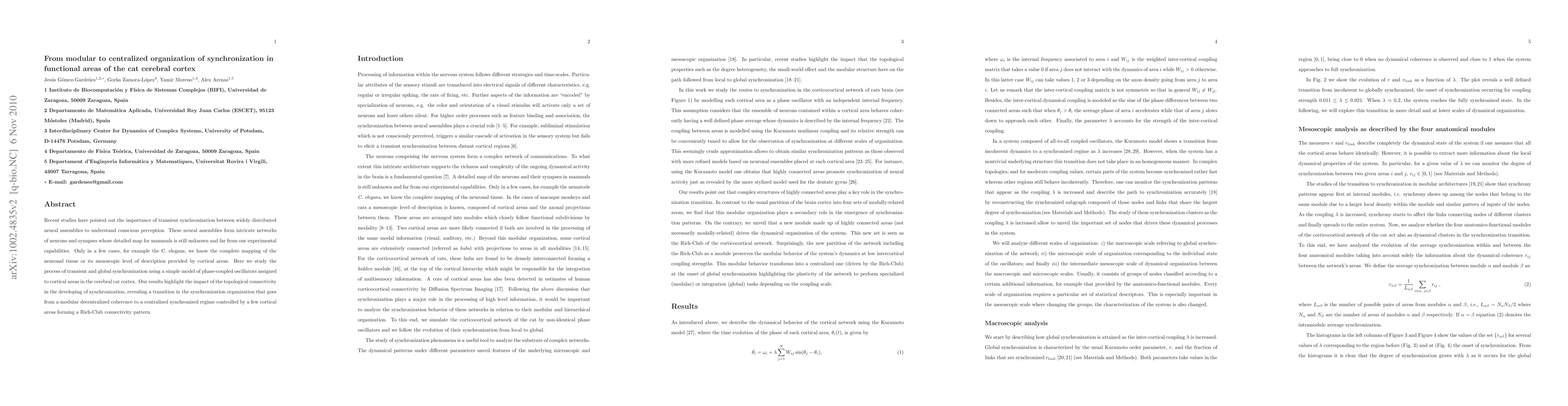 This paper explores the transition from modular to centralized synchronization in the cat cerebral cortex using a phase-coupled oscillator model. It highlights how topological connectivity influences synchronization, revealing a shift from decentralized to centralized coherence controlled by a few key cortical areas.