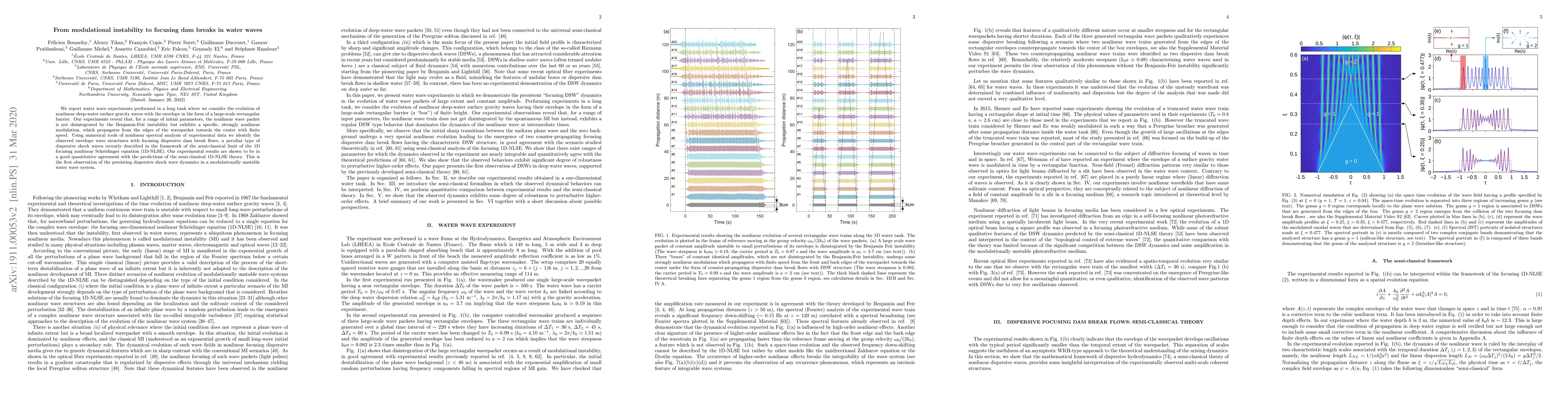 We report water wave experiments performed in a long tank where we consider the evolution of nonlinear deep-water surface gravity waves with the envelope in the form of a large-scale rectangular barrier. Our experiments reveal that, for a range of initial parameters, the nonlinear wave packet is not disintegrated by the Benjamin-Feir instability but exhibits a specific, strongly nonlinear modulation, which propagates from the edges of the wavepacket towards the center with finite speed. Using numerical tools of nonlinear spectral analysis of experimental data we identify the observed envelope wave structures with focusing dispersive dam break flows, a peculiar type of dispersive shock waves recently described in the framework of the semi-classical limit of the 1D focusing nonlinear Schrodinger equation (1D-NLSE). Our experimental results are shown to be in a good quantitative agreement with the predictions of the semi-classical 1D-NLSE theory. This is the first observation of the persisting dispersive shock wave dynamics in a modulationally unstable water wave system.