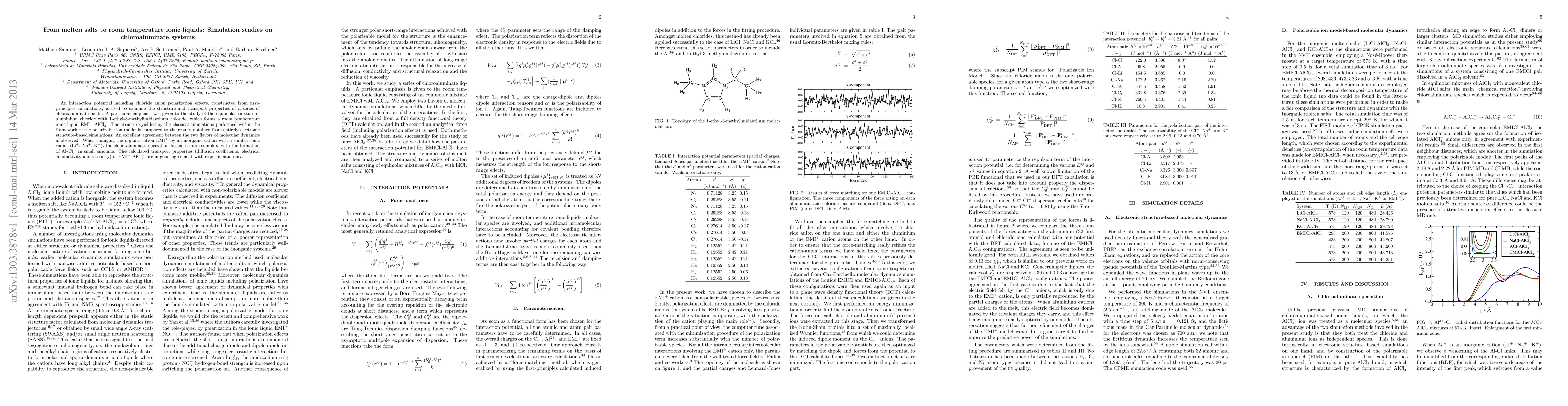 An interaction potential including chloride anion polarization effects, constructed from first-principles calculations, is used to examine the structure and transport properties of a series of chloroaluminate melts. A particular emphasis was given to the study of the equimolar mixture of aluminium chloride with 1-ethyl-3-methylimidazolium chloride, which forms a room temperature ionic liquid EMI-AlCl 4. The structure yielded by the classical simulations performed within the framework of the polarizable ion model is compared to the results obtained from entirely electronic structure-based simulations: An excellent agreement between the two flavors of molecular dynamics is observed. When changing the organic cation EMI+ by an inorganic cation with a smaller ionic radius (Li+, Na+, K+), the chloroaluminate speciation becomes more complex, with the formation of Al2Cl 7- in small amounts. The calculated transport properties (diffusion coefficients, electrical conductivity and viscosity) of EMI-AlCl4 are in good agreement with experimental data.