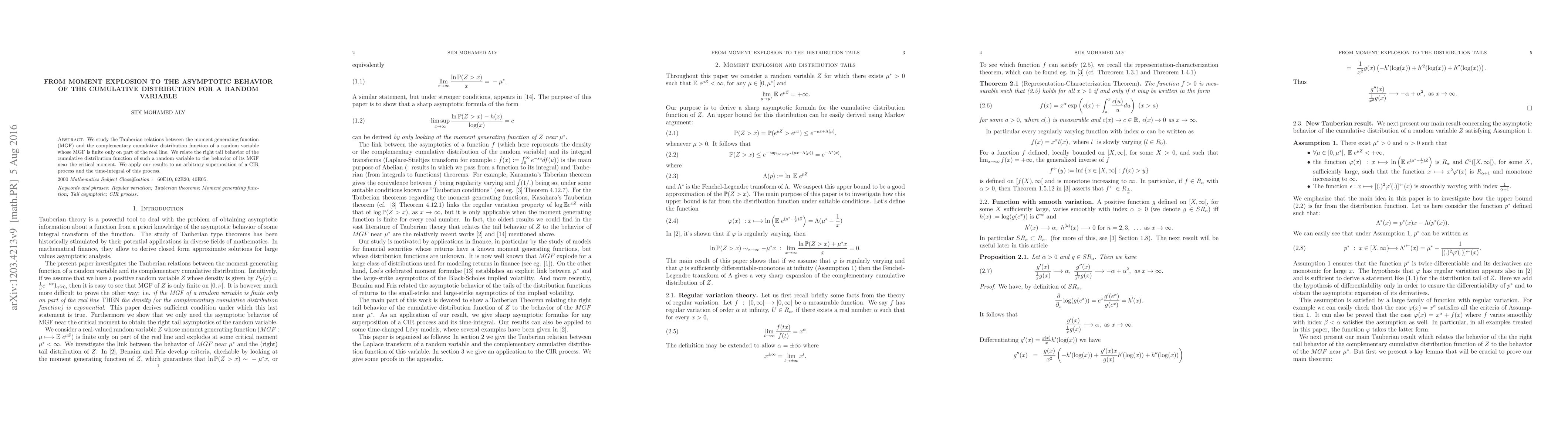 We study the Tauberian relations between the moment generating function (MGF) and the complementary cumulative distribution function of a random variable whose MGF is finite only on part of the real line. We relate the right tail behavior of the cumulative distribution function of such a random variable to the behavior of its MGF near the critical moment. We apply our results to an arbitrary superposition of a CIR process and the time-integral of this process.