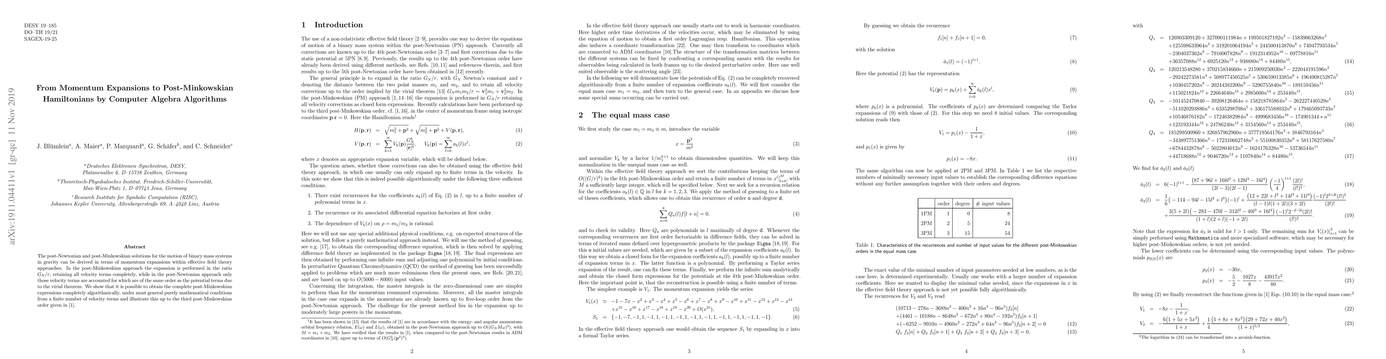 This paper demonstrates a method to derive post-Minkowskian Hamiltonians for binary mass systems using computer algebra, focusing on momentum expansions. It shows how algorithmic approaches can generate complete post-Minkowskian expressions from a finite set of velocity terms, illustrated up to the third order.