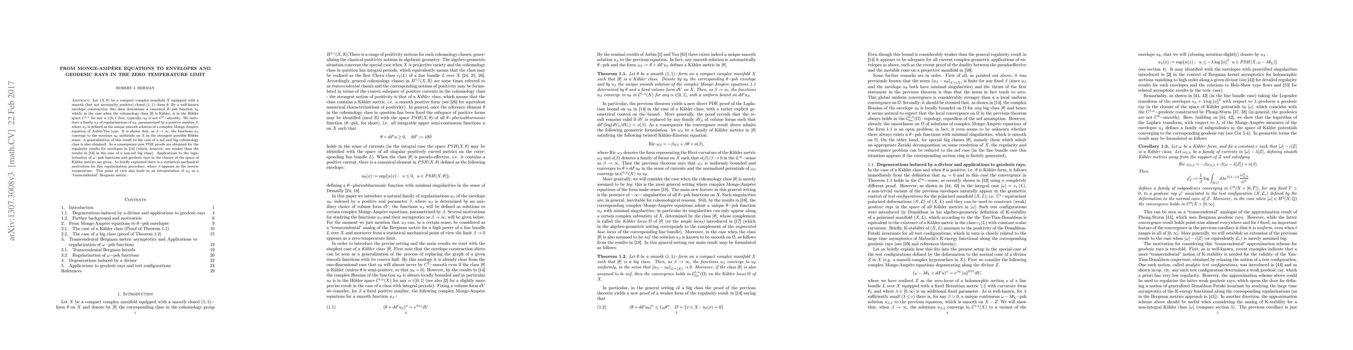 Let X be a compact complex manifold equipped with a smooth (but not necessarily positive) closed form theta of one-one type. By a well-known envelope construction this data determines a canonical theta-psh function u which is not two times differentiable, in general. We introduce a family of regularizations of u, parametrized by a positive number beta, defined as the smooth solutions of complex Monge-Ampere equations of Aubin-Yau type. It is shown that, as beta tends to infinity, the regularizations converge to the envelope u in the strongest possible Holder sense. A generalization of this result to the case of a nef and big cohomology class is also obtained. As a consequence new PDE proofs are obtained for the regularity results for envelopes in [14] (which, however, are weaker than the results in [14] in the case of a non-nef big class). Applications to the regularization problem for quasi-psh functions and geodesic rays in the closure of the space of Kahler metrics are given. As briefly explained there is a statistical mechanical motivation for this regularization procedure, where beta appears as the inverse temperature. This point of view also leads to an interpretation of the regularizations as transcendental Bergman metrics.